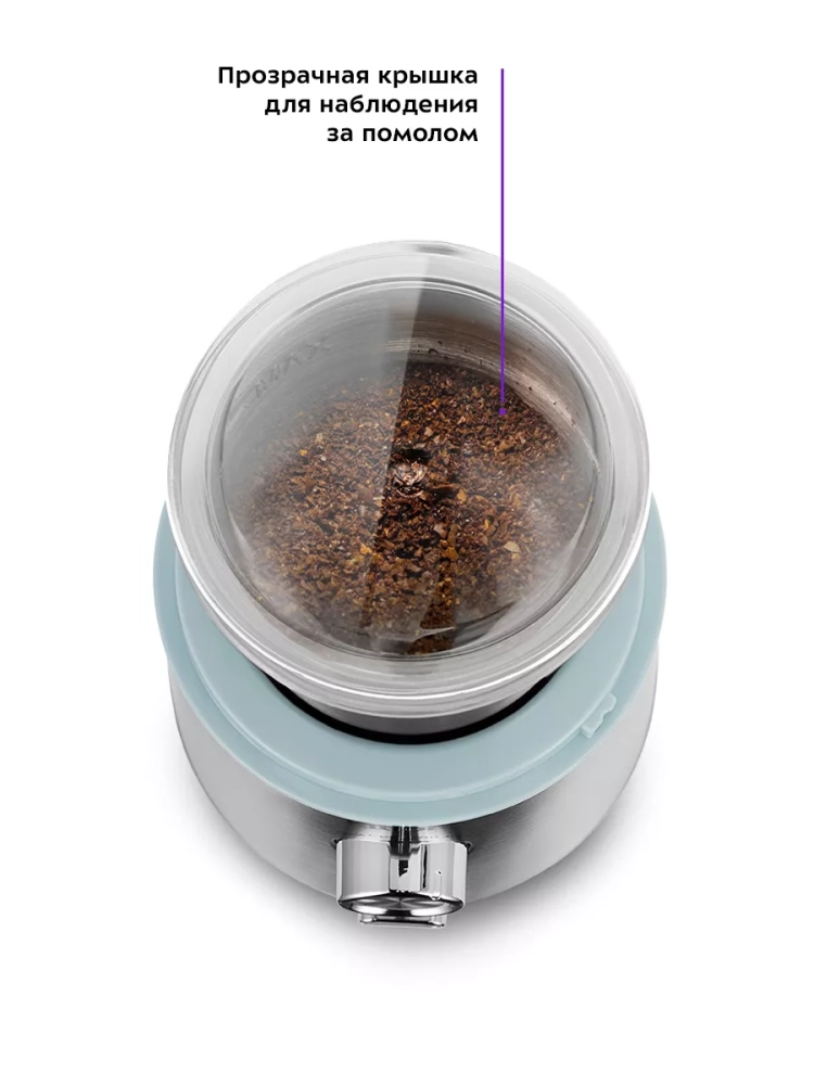 Прибор оснащен регуляторами степени помола и количества чашек. Кофемолка намелет нужное количество кофе и автоматически отключится. Кнопка включения расположена на регуляторе степени помола. Защитный механизм не позволит включить кофемолку, если крышка установлена неправильно или не установлена.