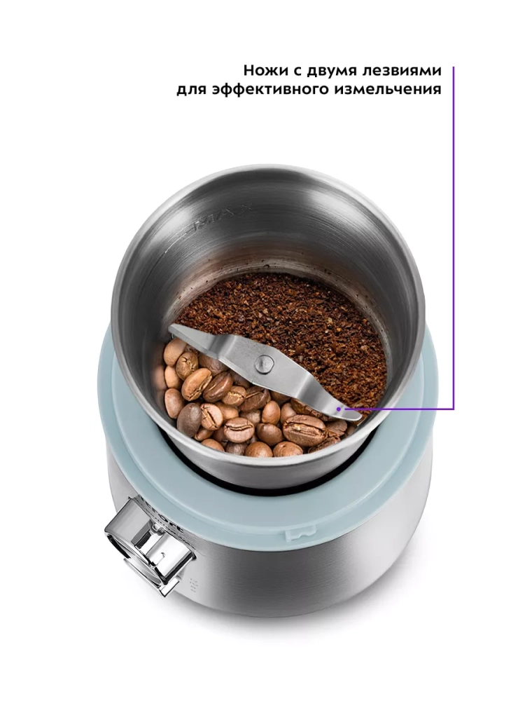 Чаша кофемолки выполнена из нержавеющей стали, а корпус и крышка из пластика. В нижней части корпуса имеется отсек для хранения сетевого шнура с механизмом смотки.