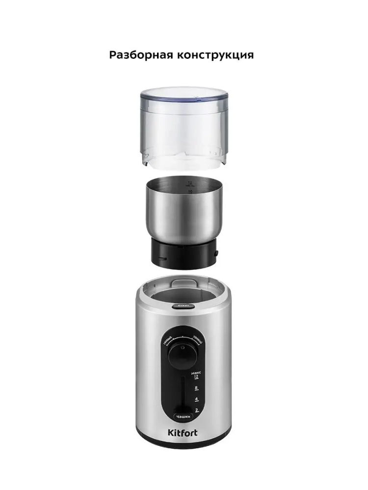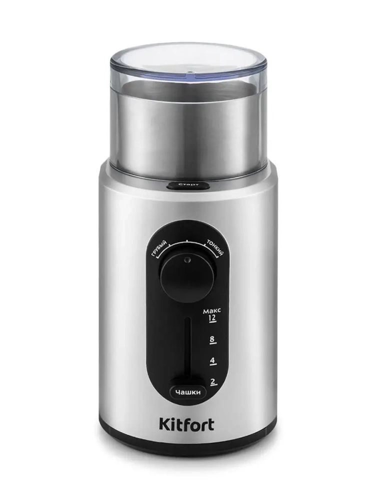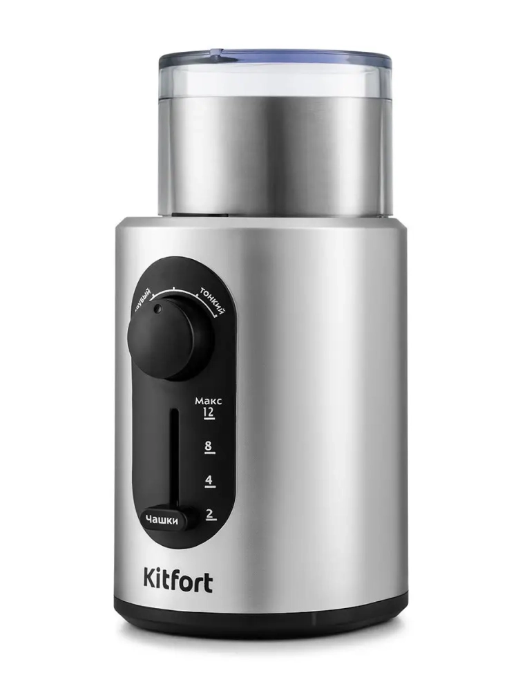 Мощная кофемолка Kitfort КТ-748 с электронным управлением предназначена для помола кофейных зерен и измельчения специй и орехов. Кофемолка укомплектована съемной чашей из нержавеющей стали и прозрачной крышкой. В чаше установлен двухлезвийный нож-дробилка для эффективного измельчения зерен кофе или специй. Прибор оснащен регуляторами степени помола и количества чашек. Кнопка включения расположена на корпусе около чаши. Защитный механизм не позволит включить кофемолку, если крышка установлена неправильно. Корпус кофеварки выполнен из пластика, а на дне есть специальные прорезиненные нескользящие ножки. В нижней части корпуса имеется отсек для хранения сетевого шнура с механизмом смотки.
