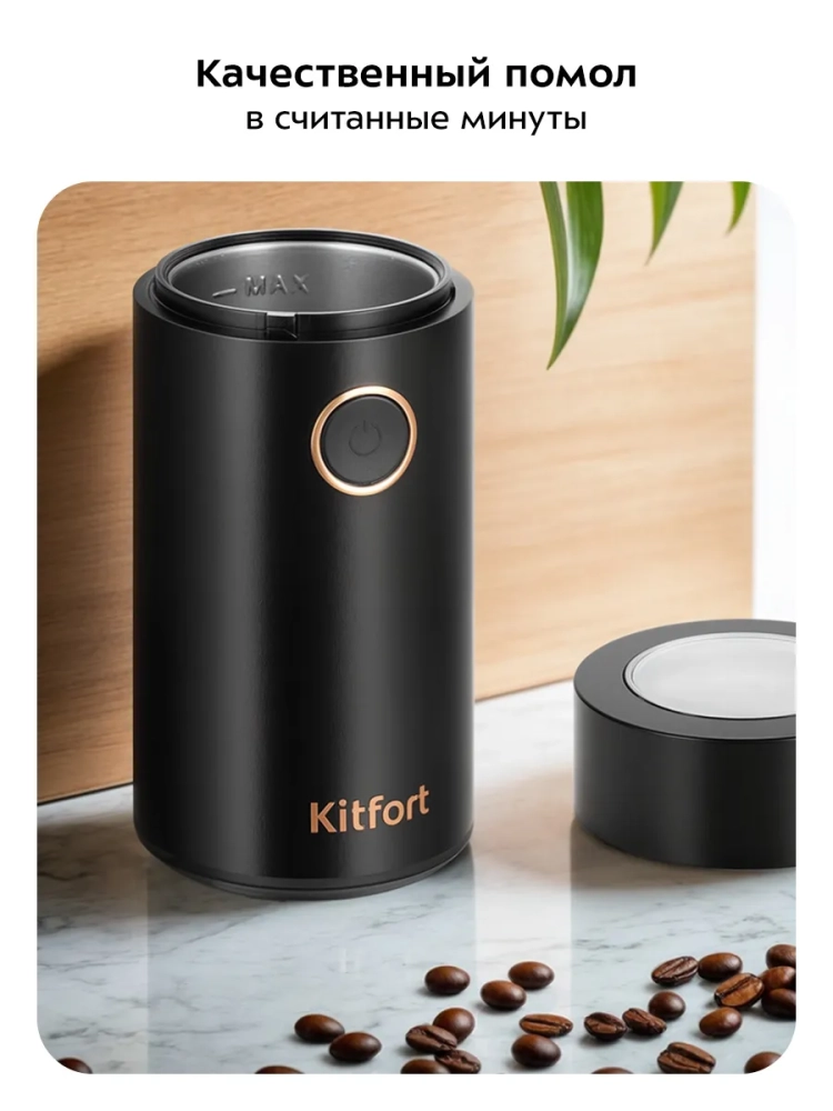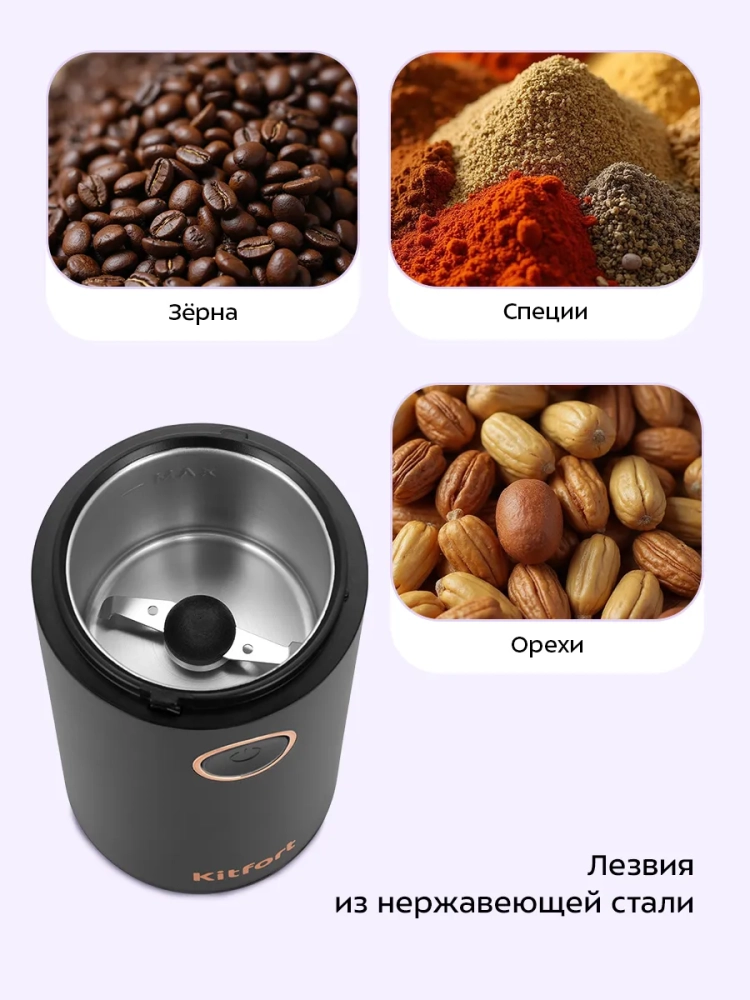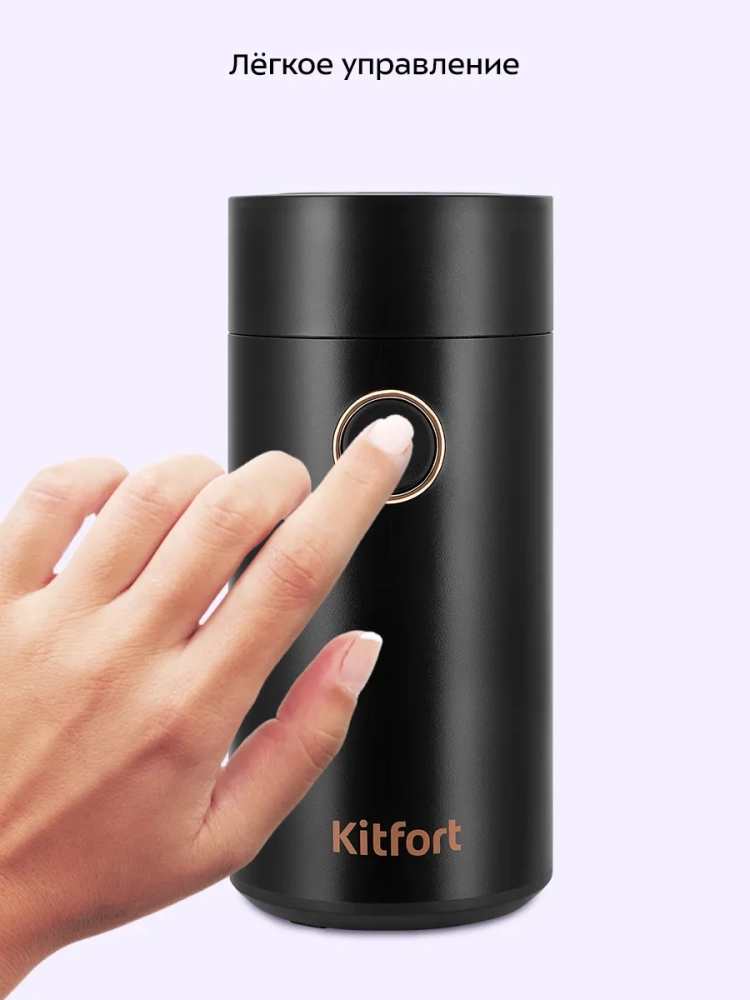 Кофемолка Kitfort КТ-7483 предназначена для помола кофейных зерен. Вы также можете использовать устройство для измельчения специй или орехов. В чаше кофемолки закреплен блок ножей с лезвиями. Ножи и чаша выполнены из нержавеющей стали. При включении кофемолки ножи быстро вращаются и рубят ингредиенты.