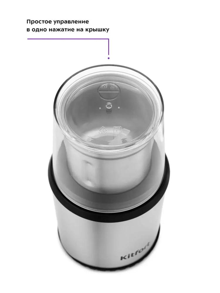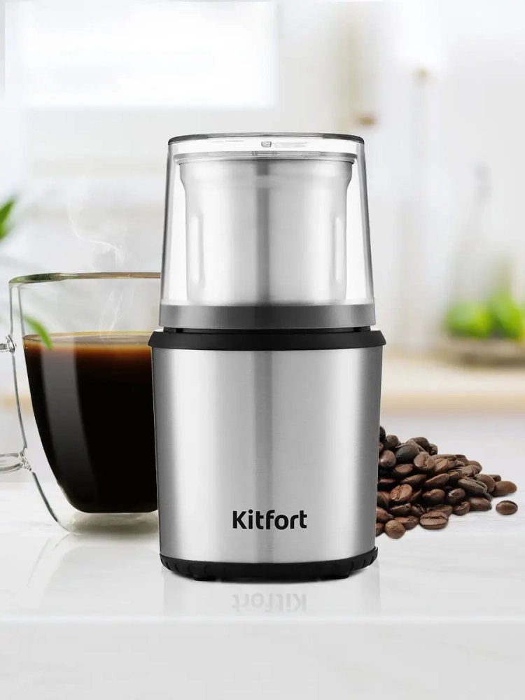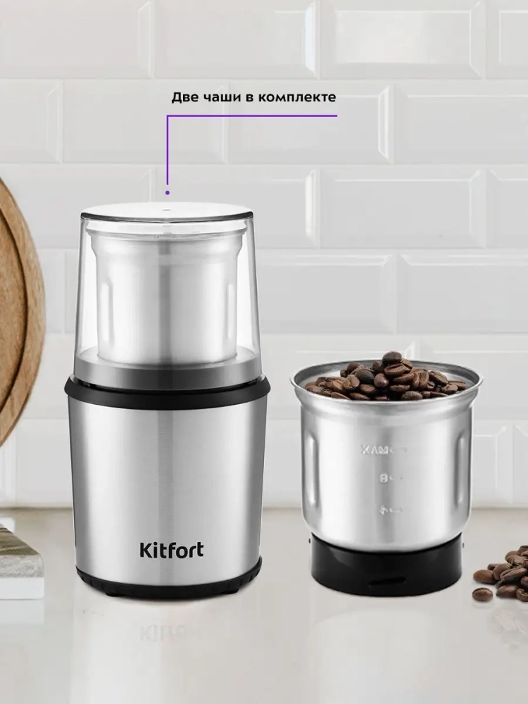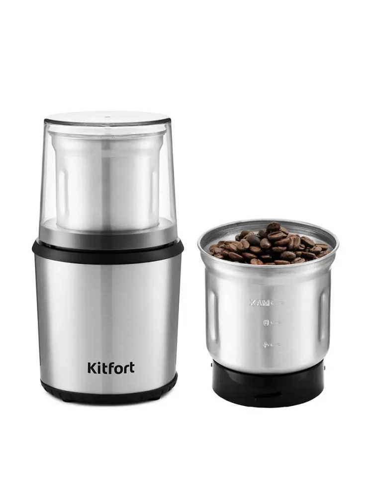 Кофемолка Kitfort КТ-757 предназначена для помола кофейных зерен и измельчения специй. Модель КТ-757 оснащена двумя чашами: чашей для кофе и чашей для специй. В чашах установлены ножи с двумя лезвиями для эффективного измельчения зерен кофе и специй. Эти ножи при включении кофемолки быстро вращаются и рубят зерна. Степень помола зависит от продолжительности. Кофемолка укомплектована прозрачной верхней крышкой и прозрачной крышкой каждой чаши. Корпус кофемолки выполнен из металла с элементами из пластика, а на дне есть специальные прорезиненные нескользящие ножки, которые придают устойчивость прибору во время работы. Кофемолка проста в эксплуатации: нет никаких лишних кнопок, а включается она простым нажатием на верхнюю крышку. Для очищения чаш в комплекте есть ложка-щеточка, на одном конце которой предусмотрена удобная щеточка для чистки ножа и стенок чаши, а ложкой на другом конце можно дозировать количество ингредиентов.