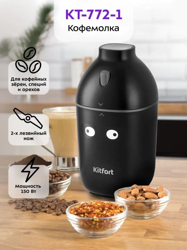 Электрическая кофемолка Kitfort КТ-772 — это незаменимый прибор для вашей кухни, который обеспечивает качественное приготовление ароматного кофе. Благодаря мощной технике и современному дизайну, эта модель станет отличным дополнением к любым кухонным девайсам. Электрическая кофемолка оснащена мощным мотором на 150 Вт, что позволяет быстро и эффективно измельчать кофейные зерна, специи и приправы.