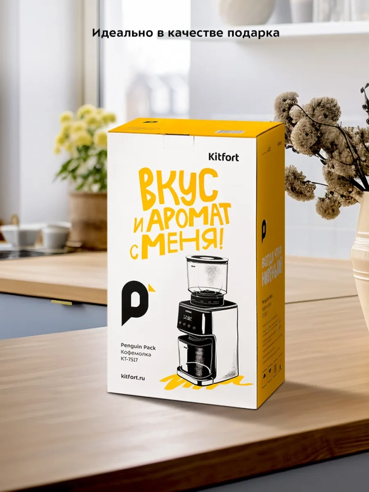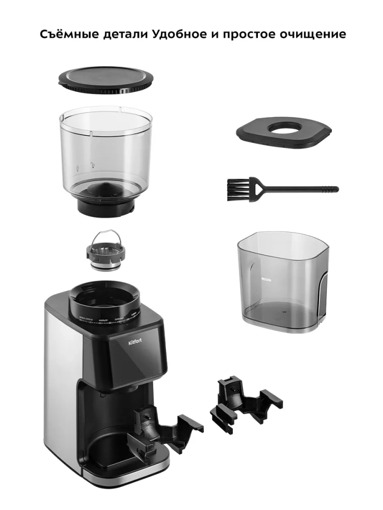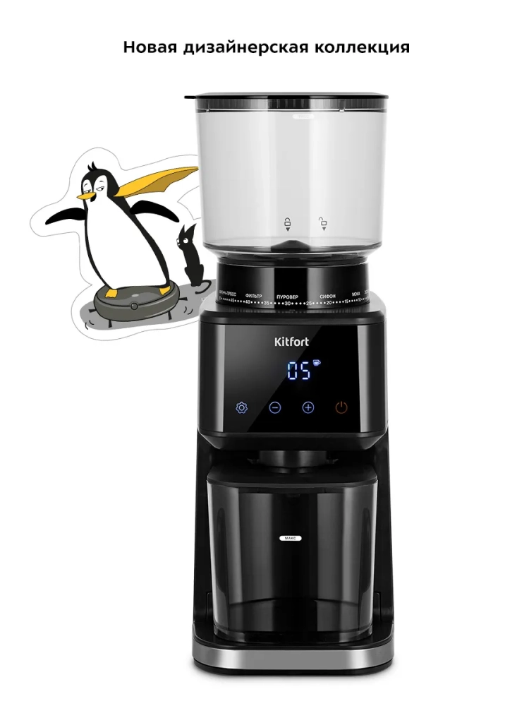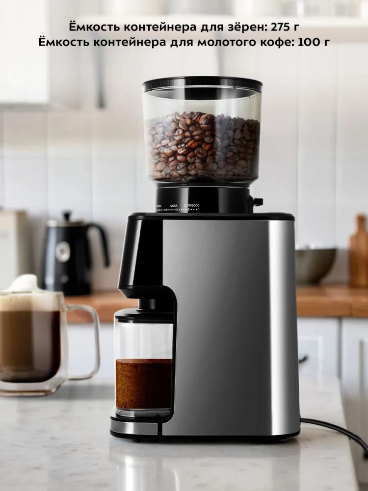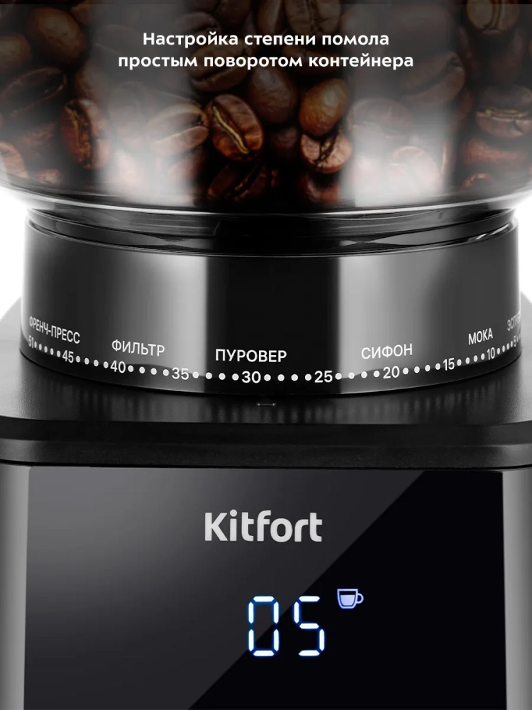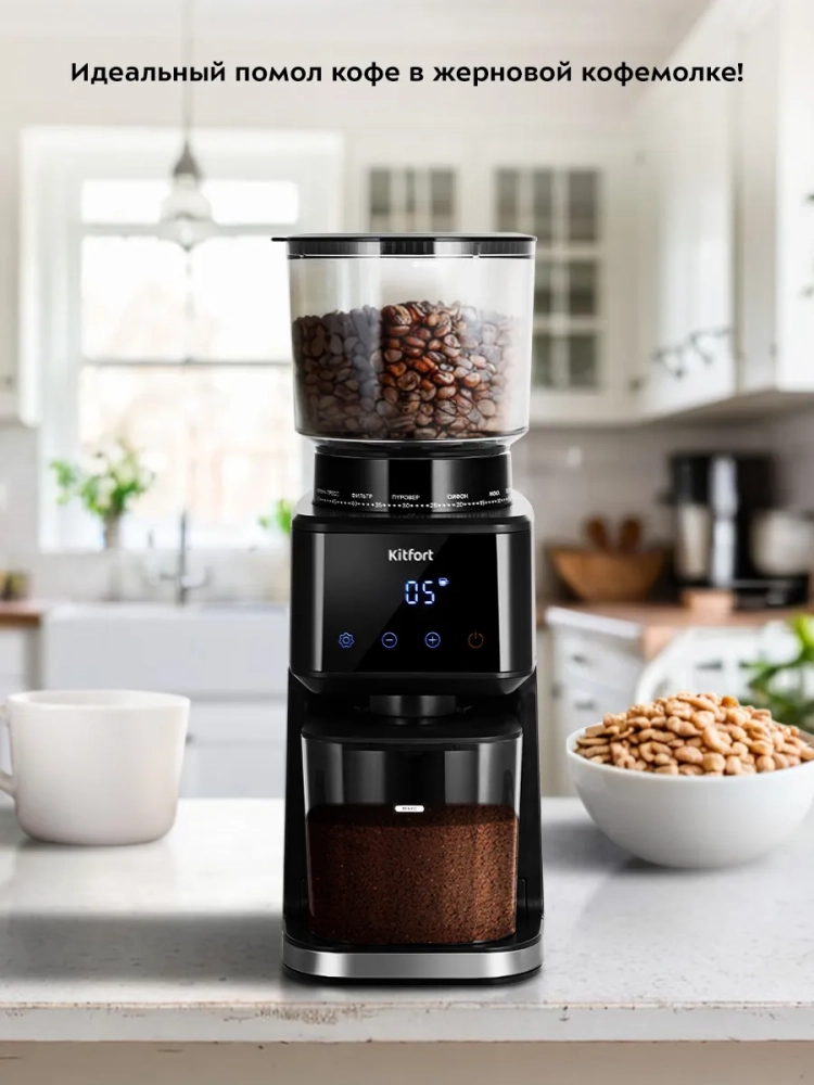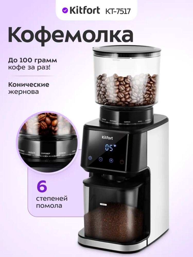 Электрическая жерновая кофемолка Kitfort КТ-7517 — это идеальный прибор для истинных ценителей кофе. Этот товар оснащен коническими металлическими жерновами, которые обеспечивают равномерный помол кофейных зерен. Жерновой механизм позволяет настроить степень помола: от мелкого для эспрессо до крупного для френч-пресса, что положительно сказывается на вкусе вашего любимого напитка. Кофемолка Kitfort не перегревает кофе во время помола, в отличие от роторных моделей. Вы можете выбрать количество зерен для помола в электокофемолке или установить таймер на 40 секунд. После завершения процесса устройство автоматически отключается, что делает его использование безопасным и удобным. Конструкция жерновов включает два конуса: внешний неподвижный и внутренний вращающийся. Зерна перемалываются между ними быстро и без перегрева. Съемные контейнеры для молотого кофе и зерен упрощают процесс очистки устройства после использования. В комплекте с кофемолкой идет маленькая щетка для чистки жерновов и два держателя рожка, которые позволяют запускать процесс помола при установке рожка в держатель. Подсветка области подачи молотого кофе помогает контролировать уровень наполненности рожка. Электрокофемолка китфорт также оснащена звуковыми сигналами и переключателем безопасности: она не включится без установленного контейнера для зерен или при его неправильной фиксации. В случае перегрева двигателя электромельницы предусмотрена защита от перегрева. Технические характеристики включают напряжение ~220–240 В (50/60 Гц), мощность 165 Вт, емкость контейнера для зерен 275 г и емкость контейнера для молотого кофе 100 г. Длина шнура составляет 0,7 м, а размеры устройства — 125 х 188 x 350 мм.