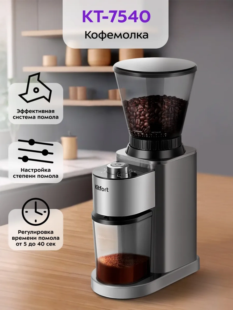 Жерновая кофемолка Kitfort КТ-7540 предназначена для помола кофейных зерен. Устройство оснащено коническими жерновами из нержавеющей стали.