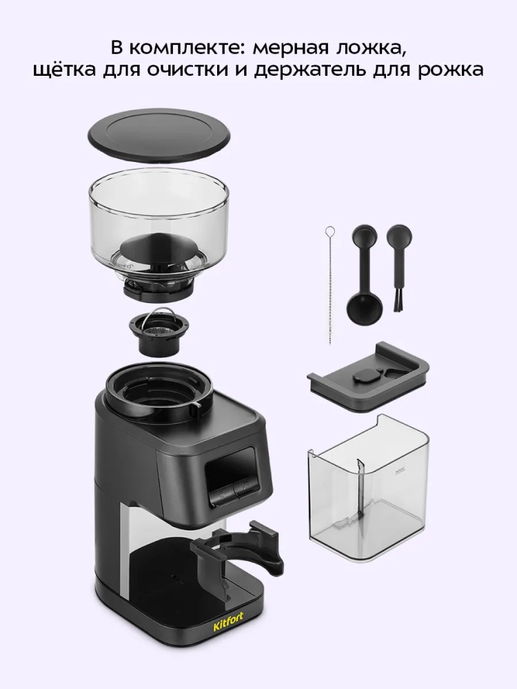 В комплекте идет держатель рожка и мерная ложка для кофе, а также щетка для чистки жерновов. Кофемолка оснащена переключателем безопасности: она не запустит помол без установленного контейнера для зерен. Нескользящие ножки не дают кофемолке скользить по столу.