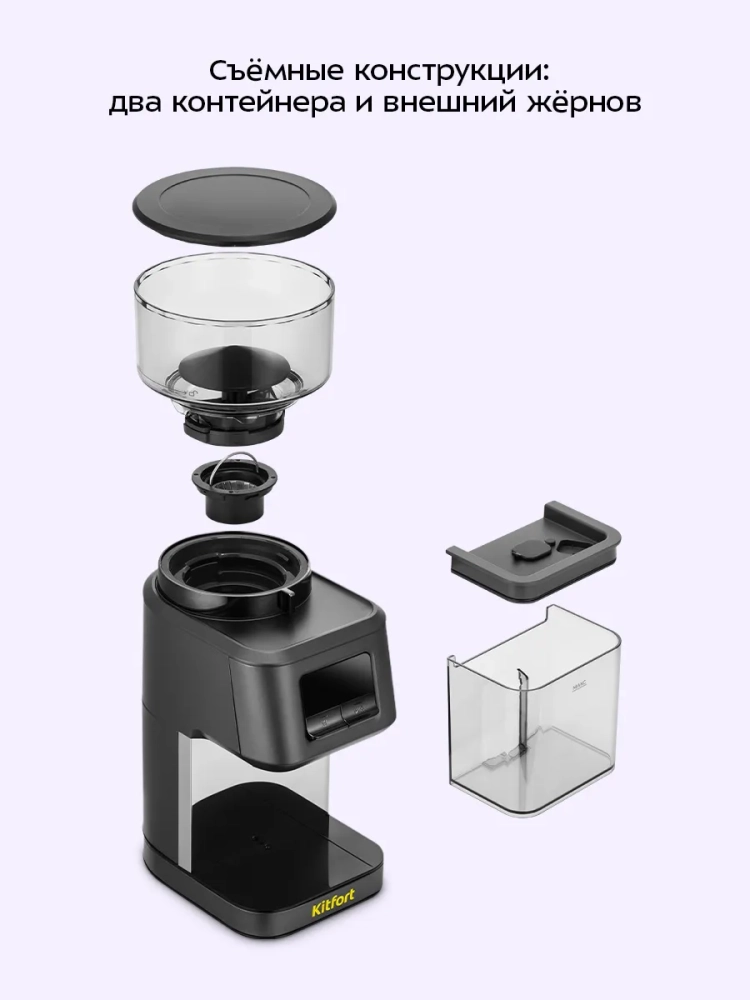 Контейнеры для молотого кофе и для зерен прозрачные, благодаря чему можно наблюдать за процессом помола кофе. Оба контейнера, а также внешний жернов съемные — для удобства очистки.