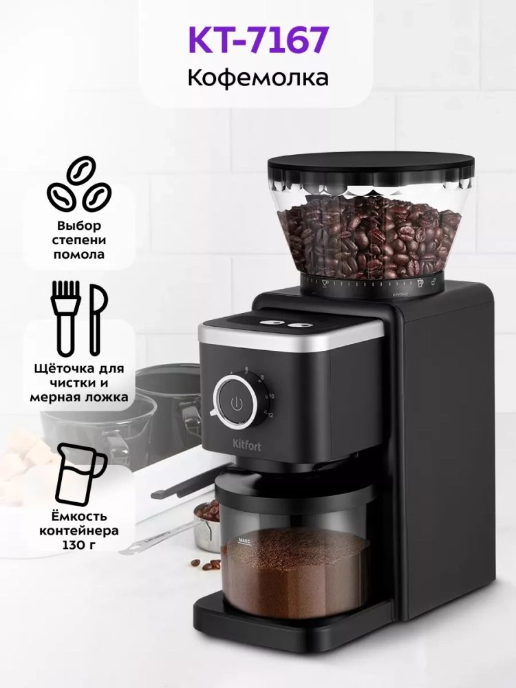 Жерновая кофемолка Kitfort КТ-7167 предназначена для помола кофейных зерен. Она оснащена коническими жерновами.