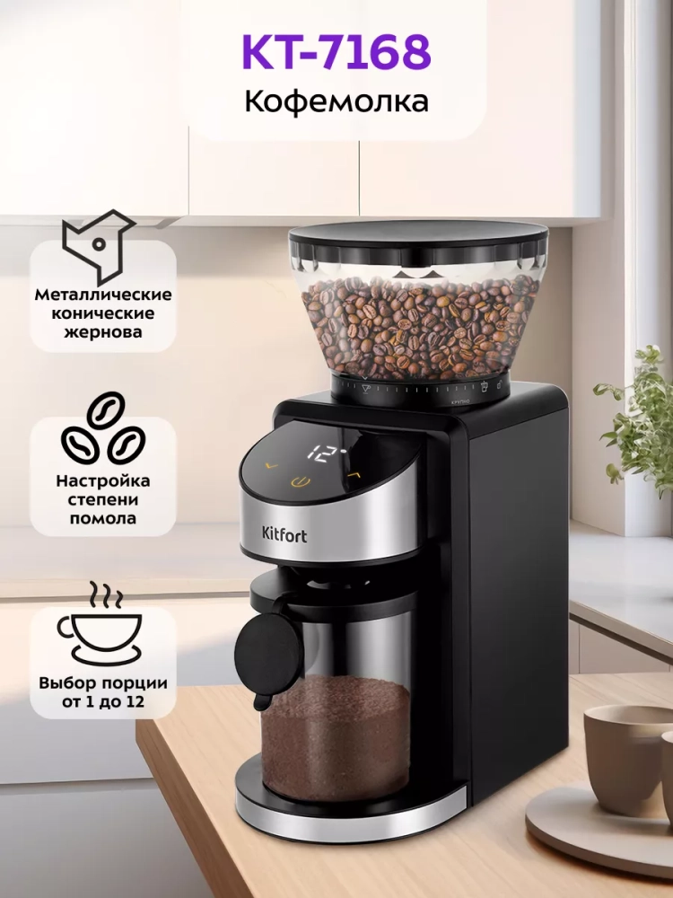 Электрическая кофемолка Kitfort КТ-7168 — это мощная техника для вашей кухни, обеспечивающая идеальный помол зерен для кофеварки. Жерновая система помола гарантирует равномерное измельчение, что позволяет раскрыть весь аромат и вкус кофе. Электрическая кофемолка Kitfort оснащена контейнером для молотого кофе, который легко снимается и очищается. Контейнеры для зерен и молотого кофе выполнены из прочных материалов, что обеспечивает долговечность прибора.