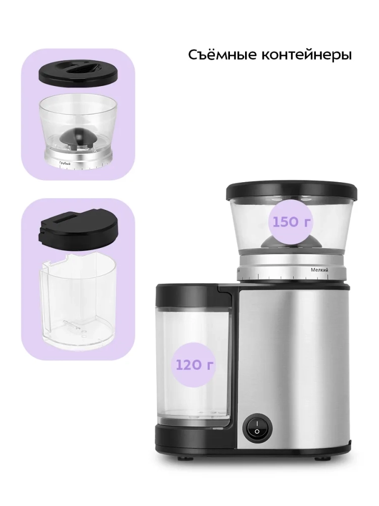 Контейнеры для молотого кофе и для зерен съемные и закрываются крышками. Верхний жернов закреплен на дне контейнера для зерен, нижний жернов установлен в моторный блок и не снимается. Для удобства очистки механизма измельчения в комплекте предусмотрена щетка для чистки жерновов.