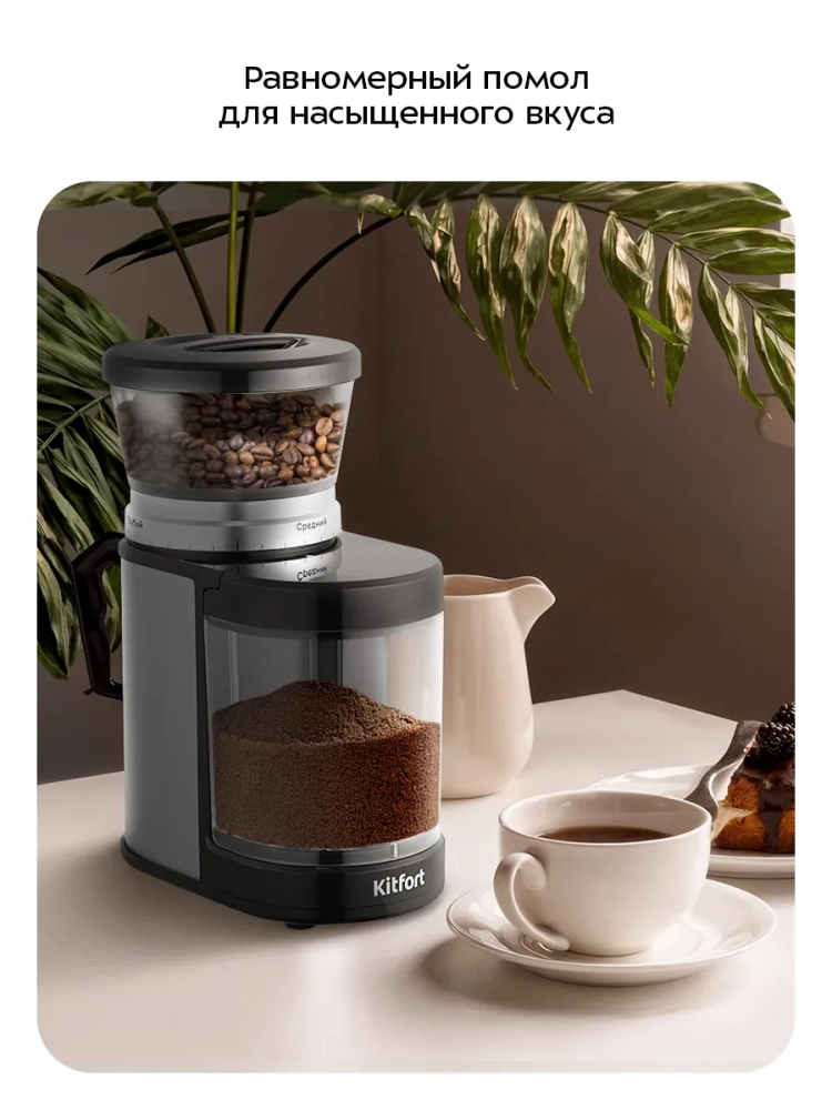 Жерновая кофемолка Kitfort КТ-7565 предназначена для помола кофейных зерен. Она оснащена плоскими жерновами из нержавеющей стали.