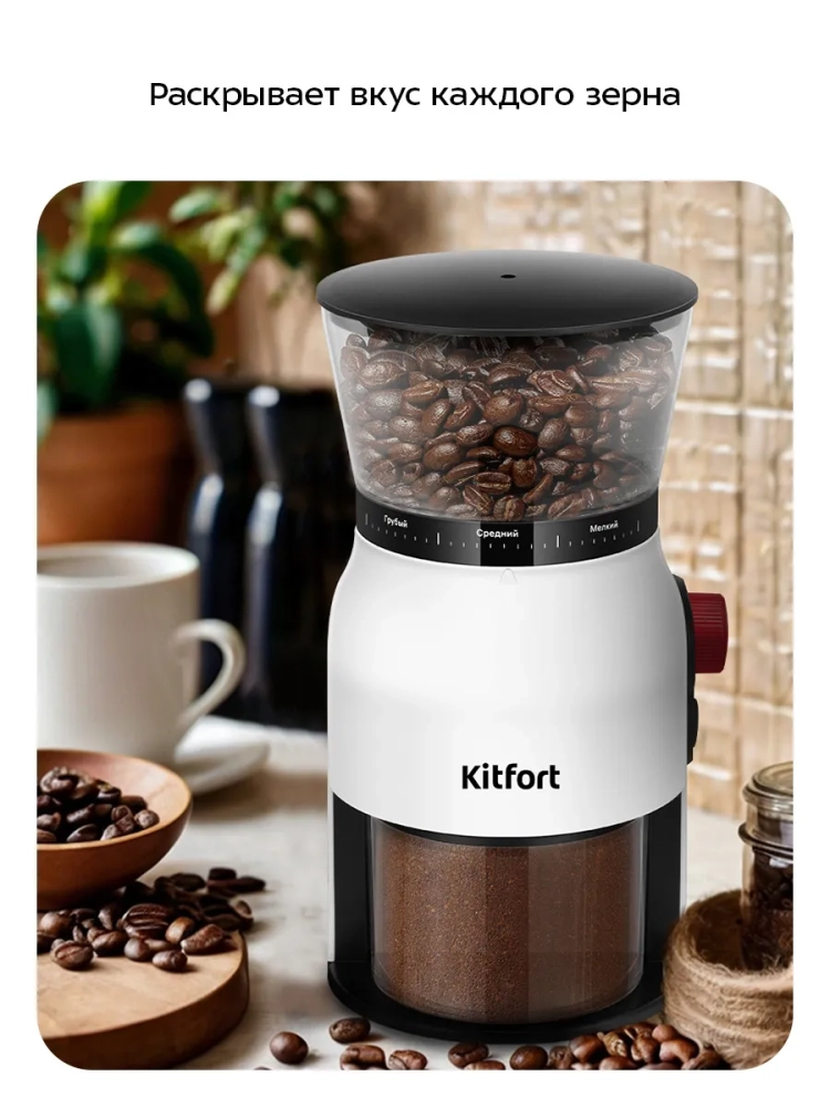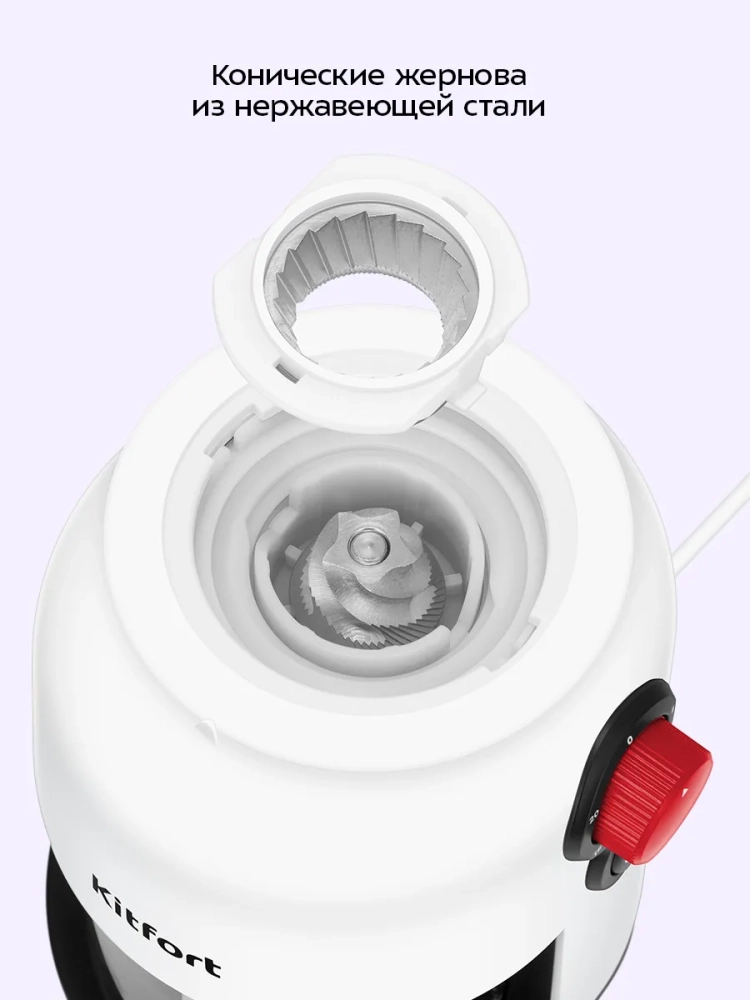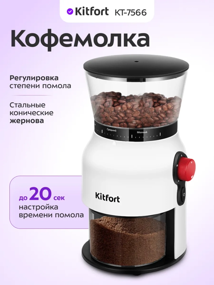 Жерновая кофемолка Kitfort КТ-7566 предназначена для помола кофейных зерен. Она оснащена плоскими жерновами из нержавеющей стали.