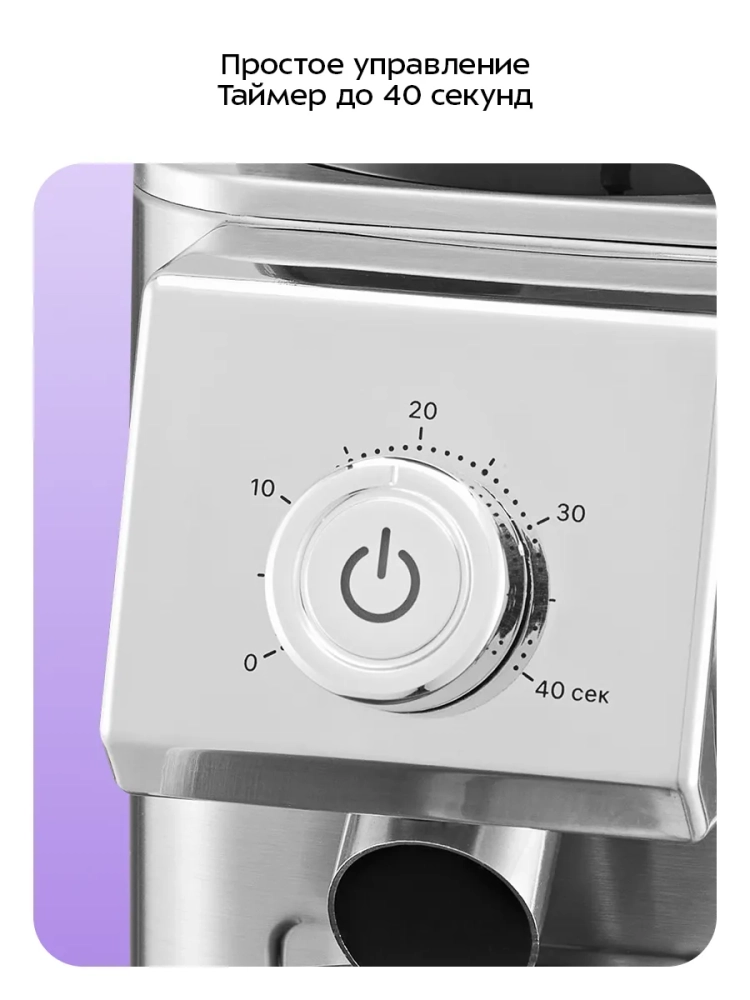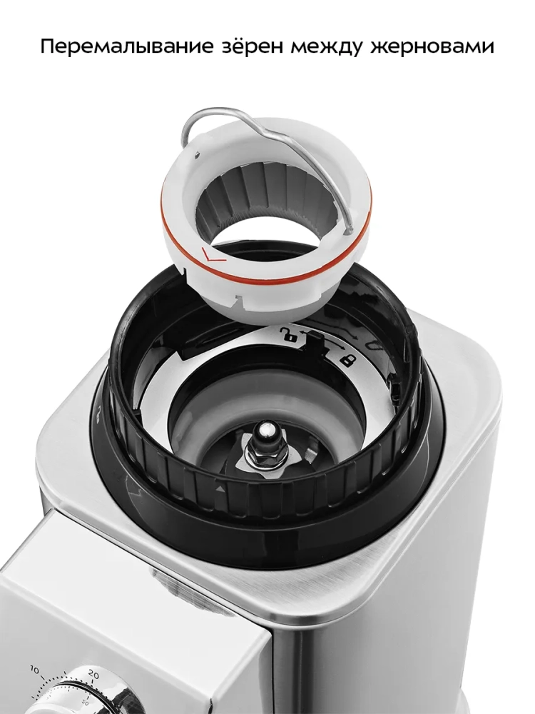 Кофемолка оснащена переключателем безопасности: она не включится, если контейнер для зерен не установлен или установлен неправильно.