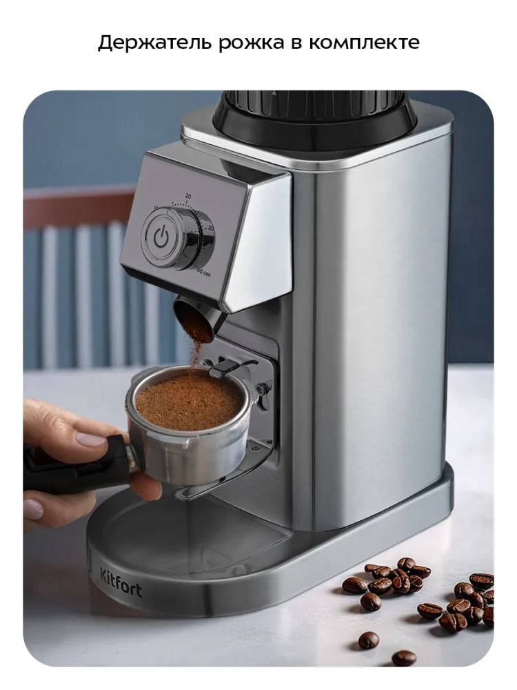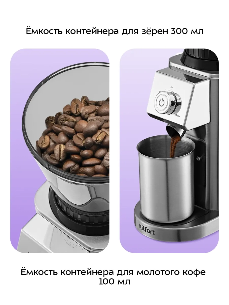 Жерновая кофемолка Kitfort КТ-7589 предназначена для помола кофейных зерен. Устройство оснащено коническими жерновами из нержавеющей стали.