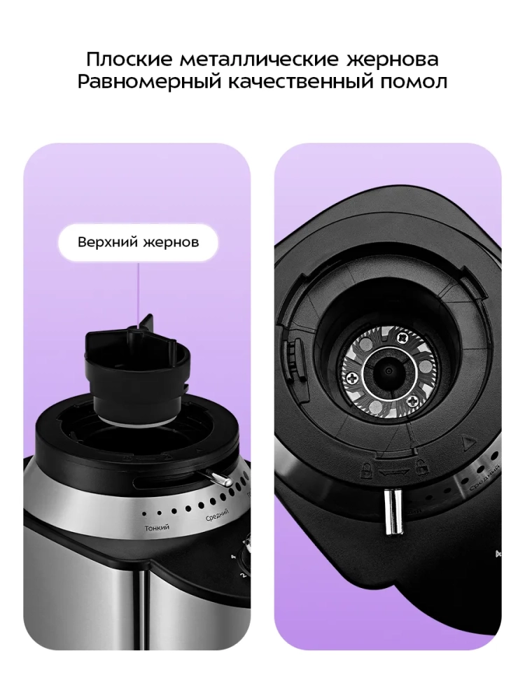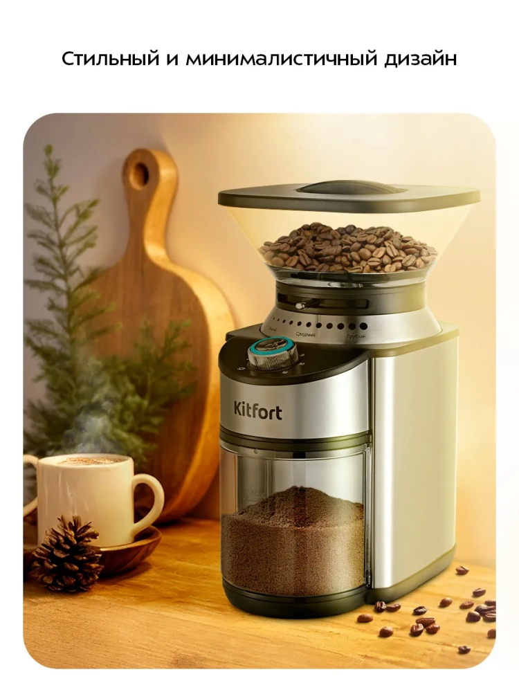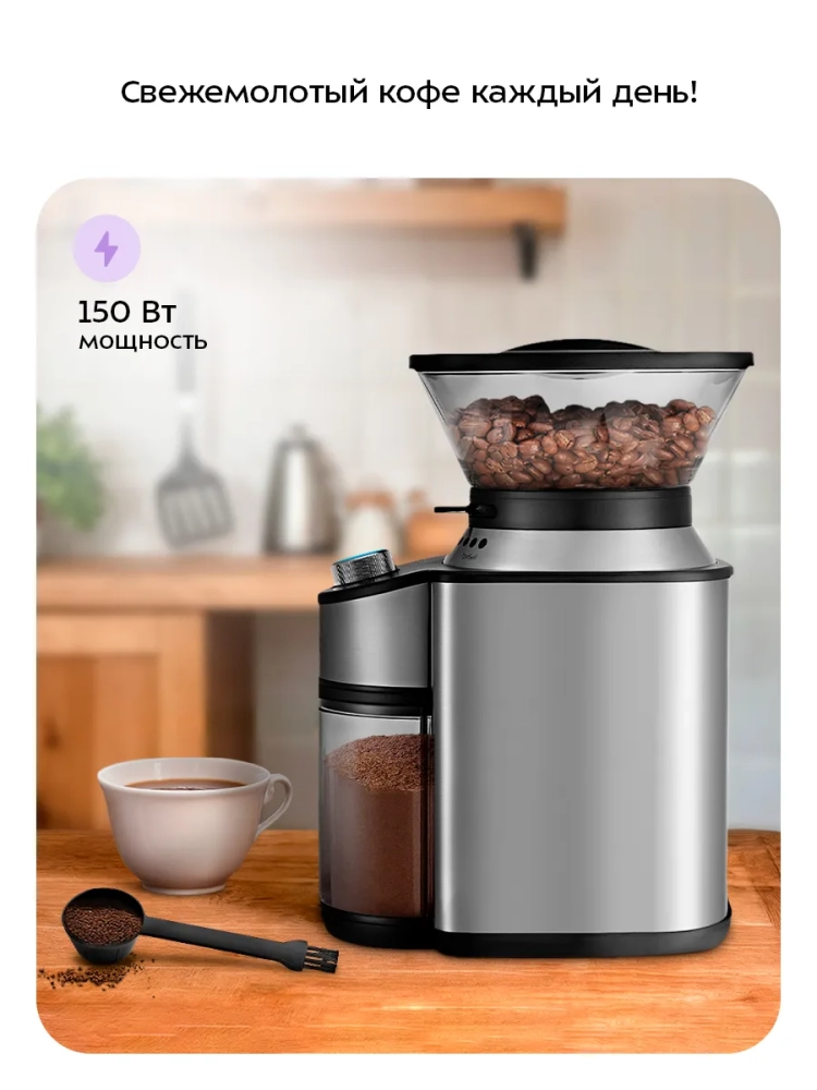 Жерновая кофемолка КТ-770 предназначена для помола кофейных зерен. Она оснащена плоскими жерновами из стали. Жерновая кофемолка дает равномерный помол и позволяет настроить его степень: от тонкого для эспрессо кофеварки до крупного для френч-пресса. Равномерный помол важен для эспрессо кофеварок, так как при неравномерном помоле вкус заваренного кофе портится. При помоле в жерновой кофемолке кофе не перегревается, как это происходит в роторных кофемолках. Вы можете выбрать, какое количество зерен требуется намолоть за один раз - кофемолка намелет нужное количество кофе и автоматически отключится. Контейнеры для молотого кофе и для зерен съемные. Внешний жернов также снимается, благодаря чему его легко очистить. Для чистки жерновов в комплекте идет мерная ложка, на ручке которой находится щеточка для чистки жерновов. Кофемолка оснащена термостатом, который отключает устройство в случае перегрева мотора. Нескользящие ножки не дают кофемолке скользить по столу.