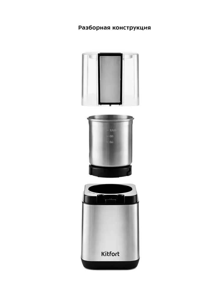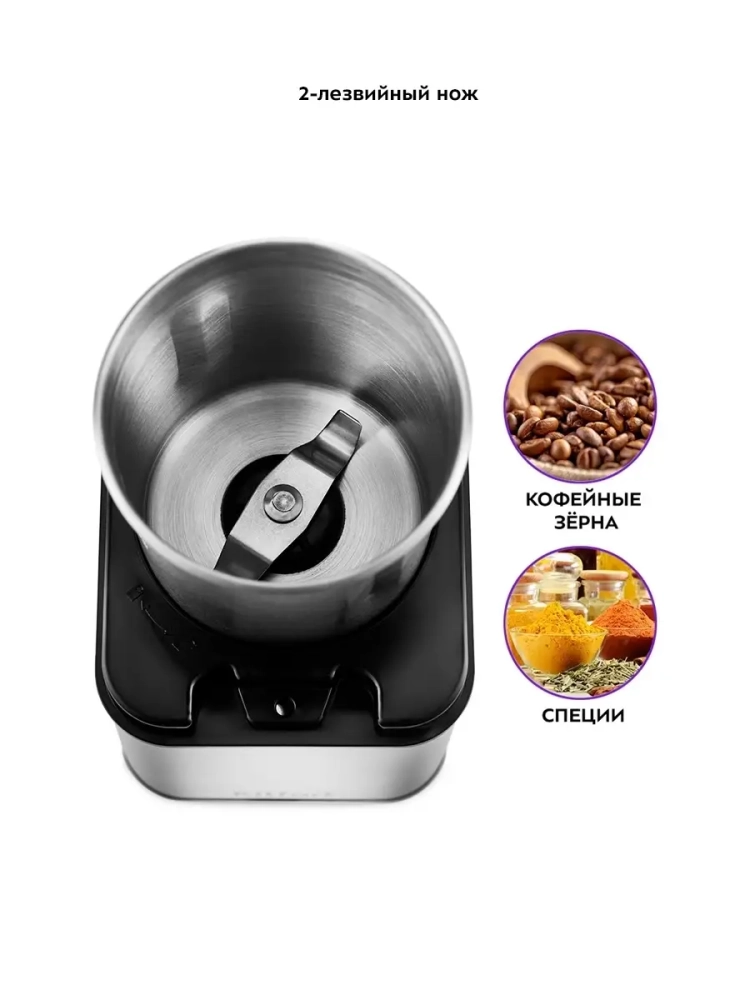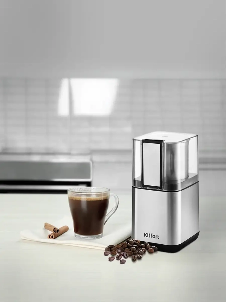 Кофемолка КТ-766 предназначена для помола кофейных зерен и измельчения специй. В чаше установлены ножи с двумя лезвиями из нержавеющей стали для эффективного измельчения зерен кофе и специй. Эти ножи при включении кофемолки быстро вращаются и рубят зерна. Степень помола зависит от продолжительности. Кофемолка укомплектована прозрачной верхней крышкой со встроенной кнопкой.Корпус кофемолки выполнен из нержавеющей стали с элементами пластика, а на дне есть специальные прорезиненные нескользящие ножки, которые придают устойчивость прибору во время работы и гасят вибрации. Кофемолка проста в эксплуатации: нет никаких лишних кнопок, а включается она простым нажатием на кнопку на верхней крышке. Защитный механизм не позволит включить кофемолку, если верхняя крышка или чаша не установлены или установлены неправильно. Кнопка включения установлена вровень с крышкой для защиты от случайного нажатия.
