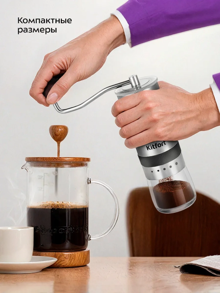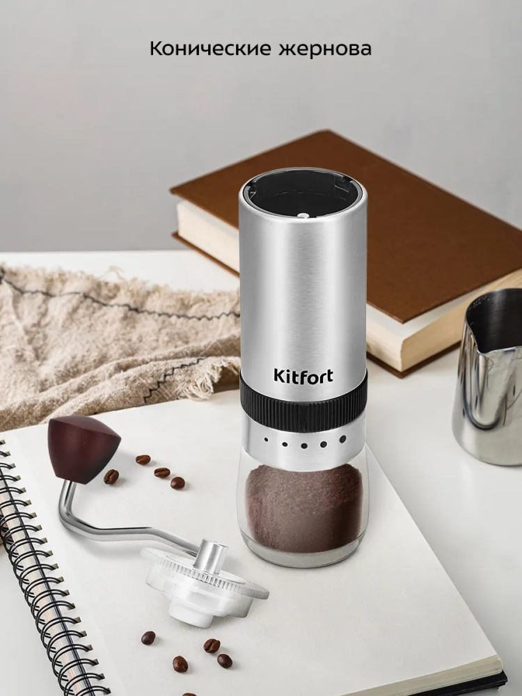 Кофемолка Kitfort КТ-7470 является ручной жерновой кофемолкой и предназначена для помола кофейных зерен. Она оснащена коническими жерновами из нержавеющей стали.