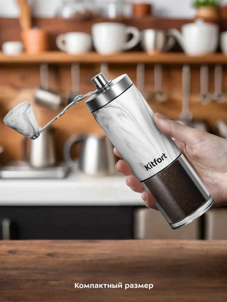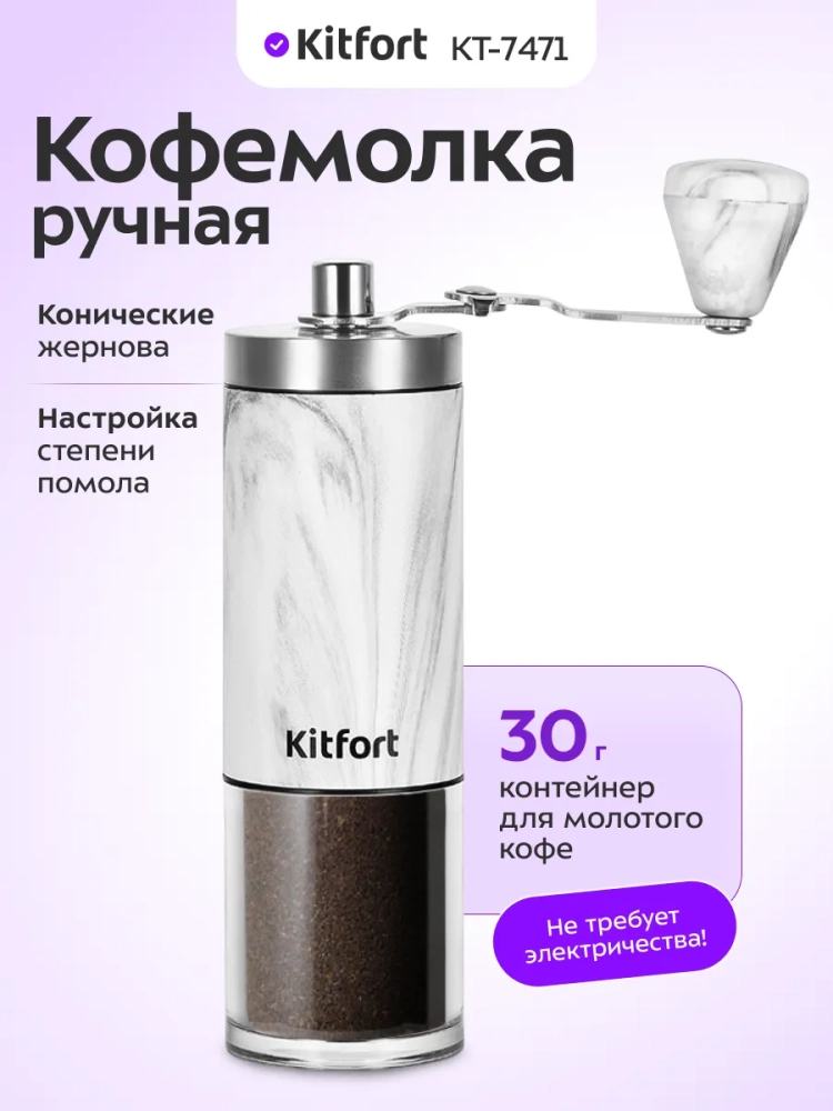 Кофемолка Kitfort КТ-7471 является ручной жерновой кофемолкой и предназначена для помола кофейных зерен. Она оснащена коническими жерновами из керамики.