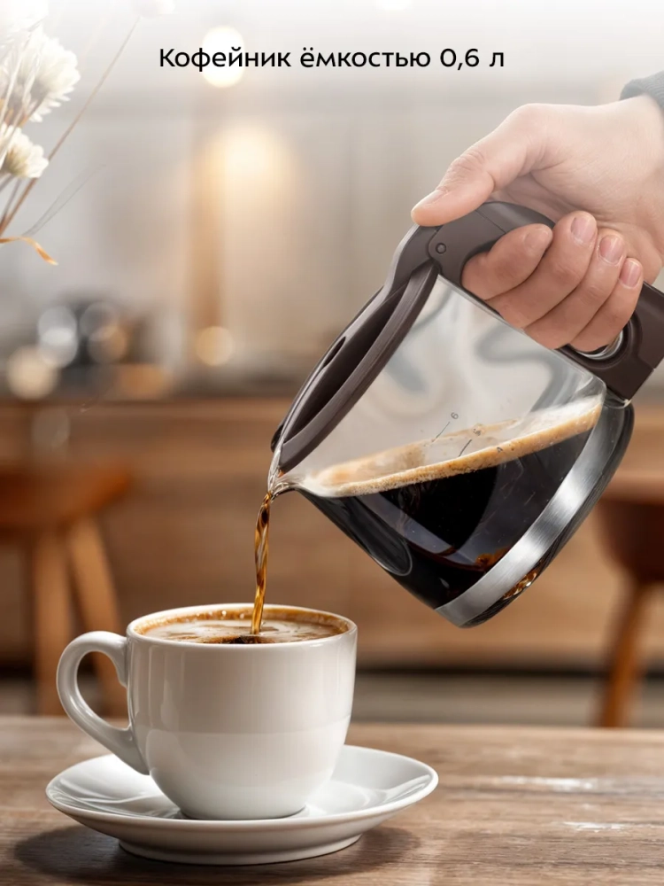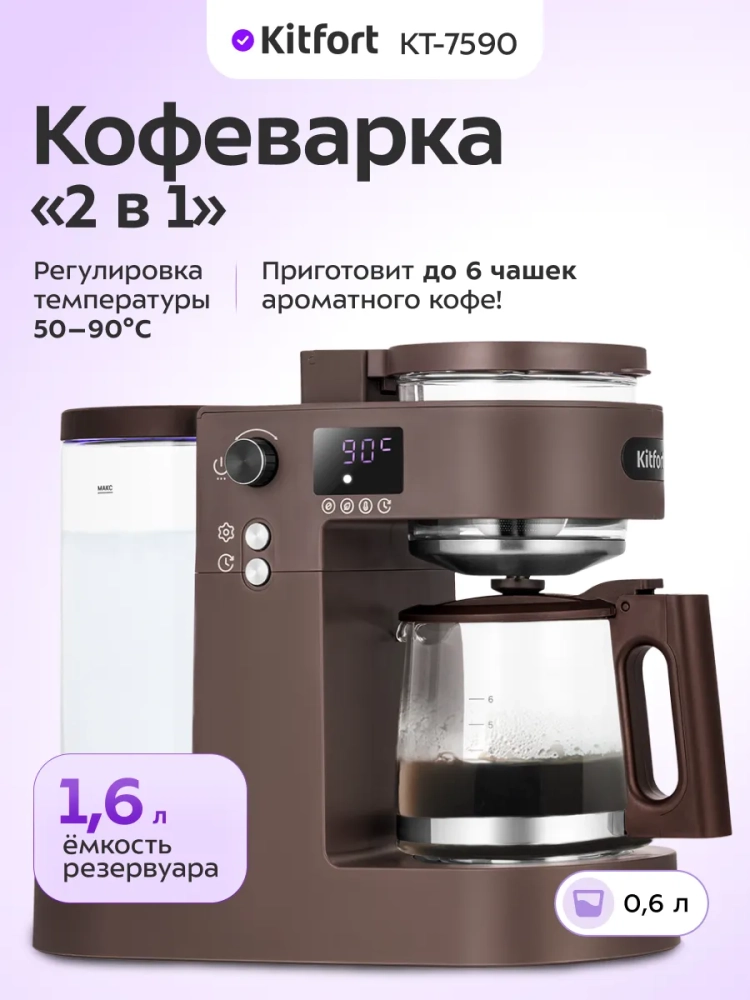 Капельная кофеварка «2 в 1» Kitfort КТ-7590 готовит ароматный черный кофе из молотых кофейных зерен и заваривает чай.