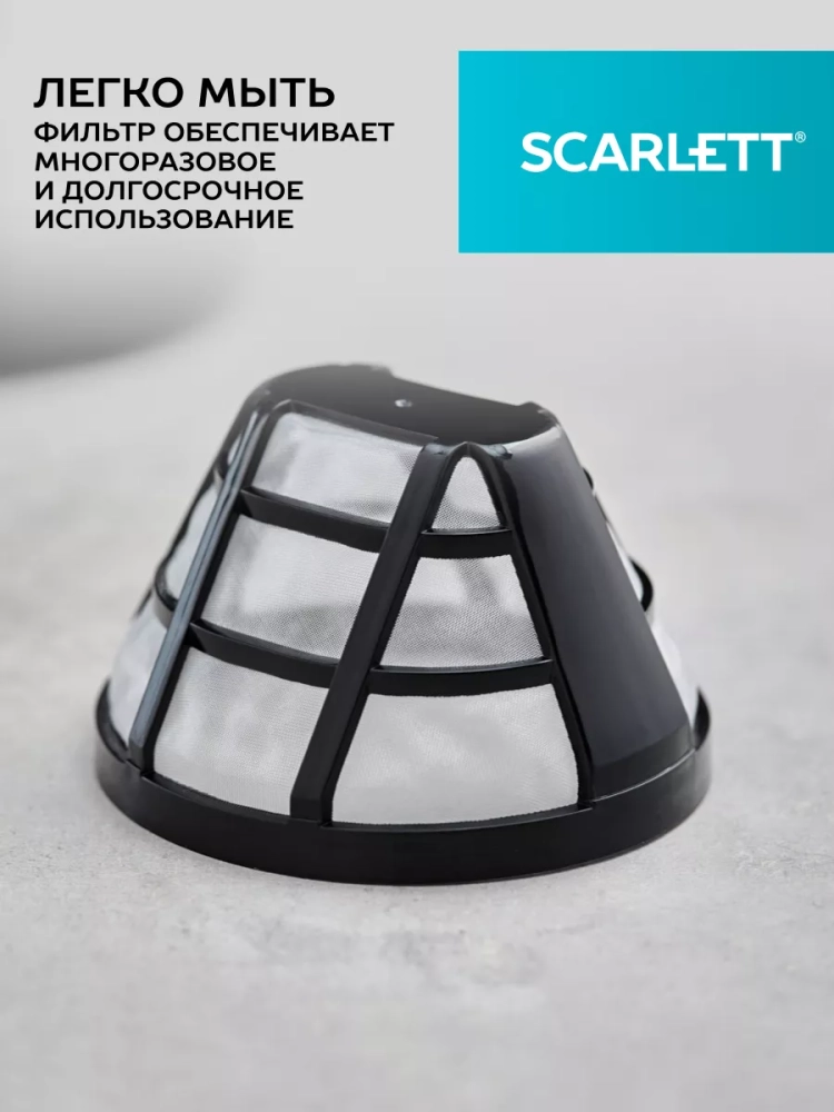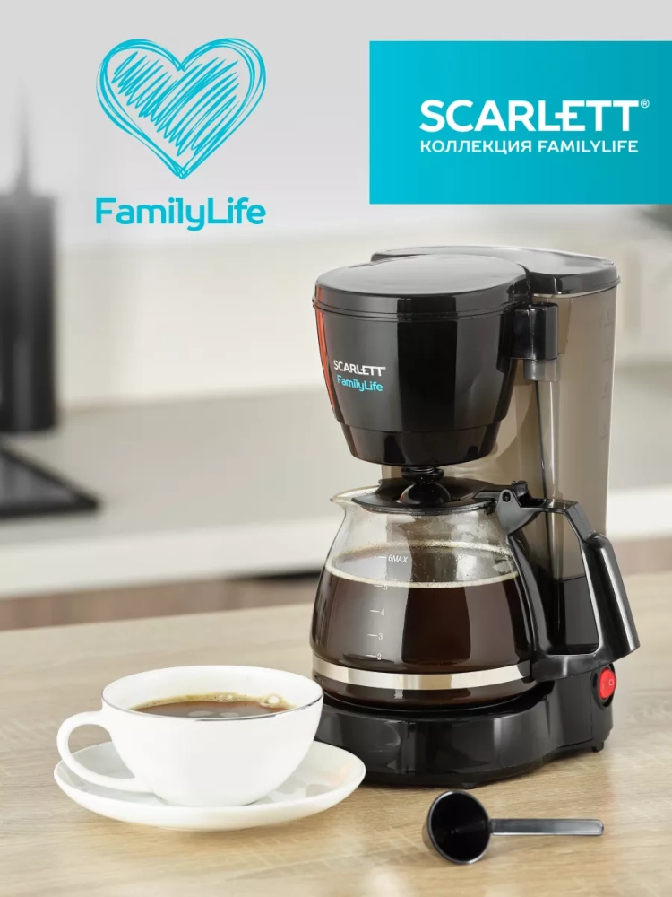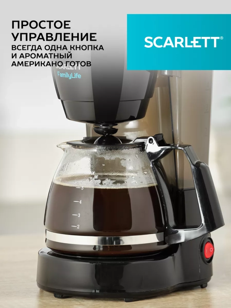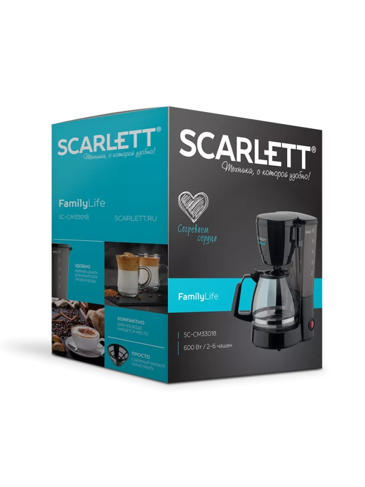 Кофеварка SC-CM33018 мощностью 600 Вт выполнена в классическом черном цвете.