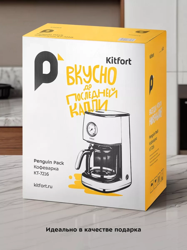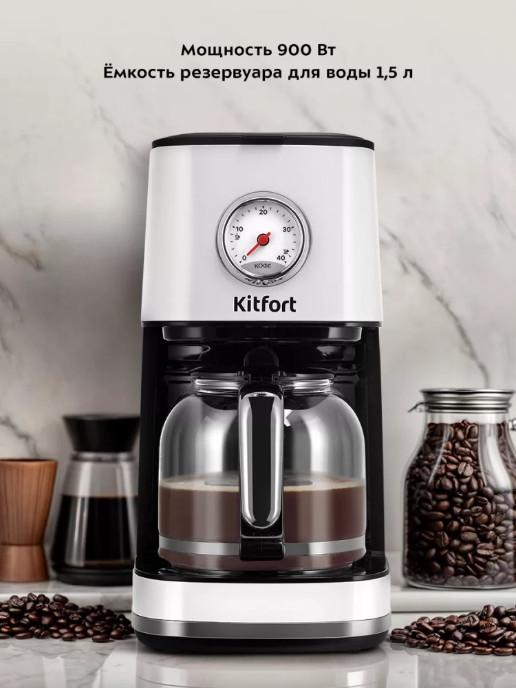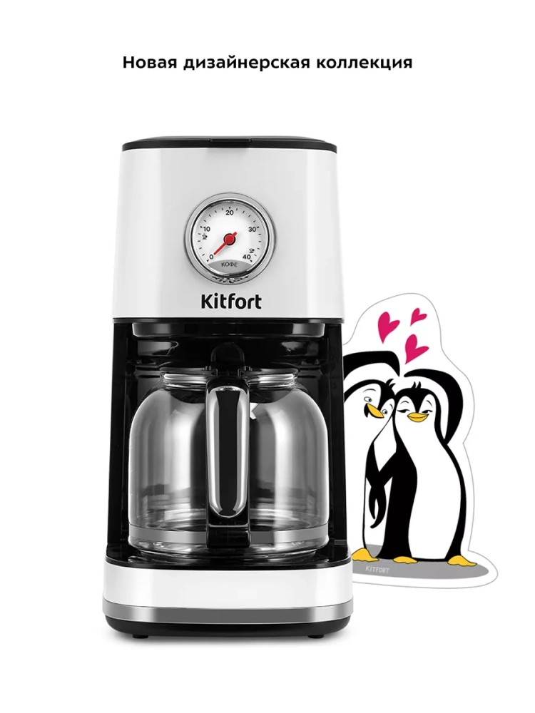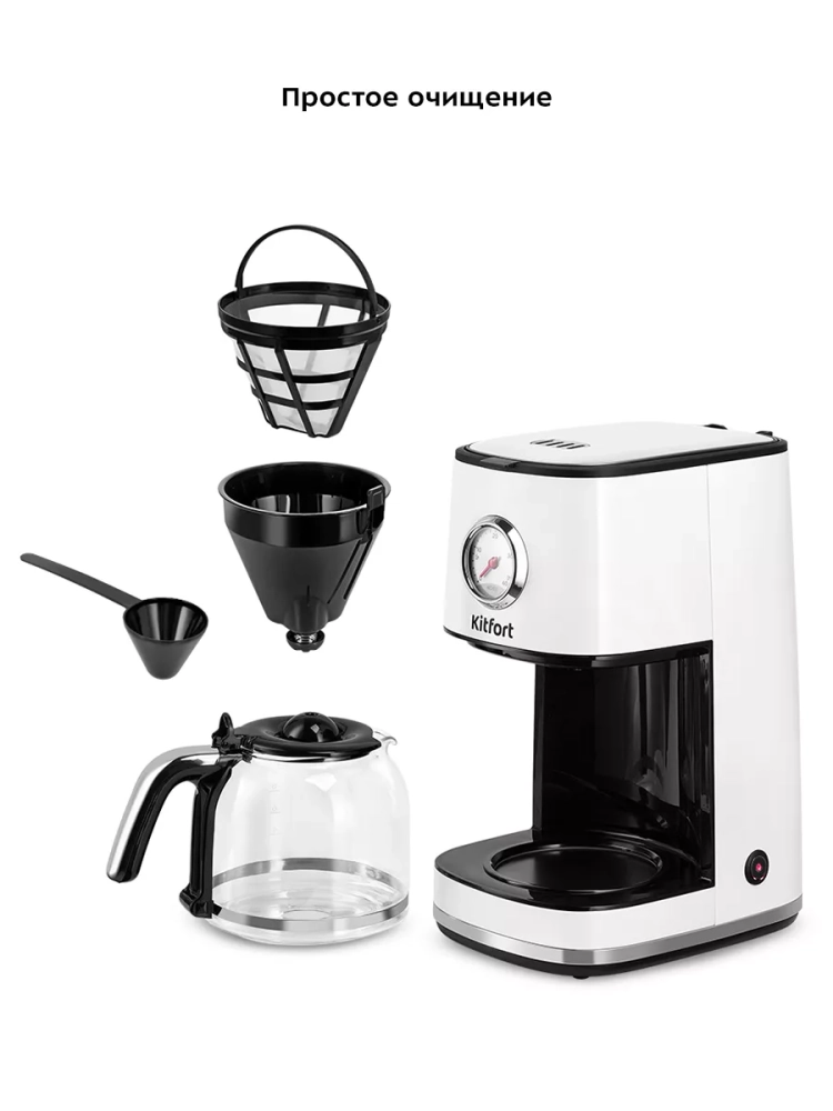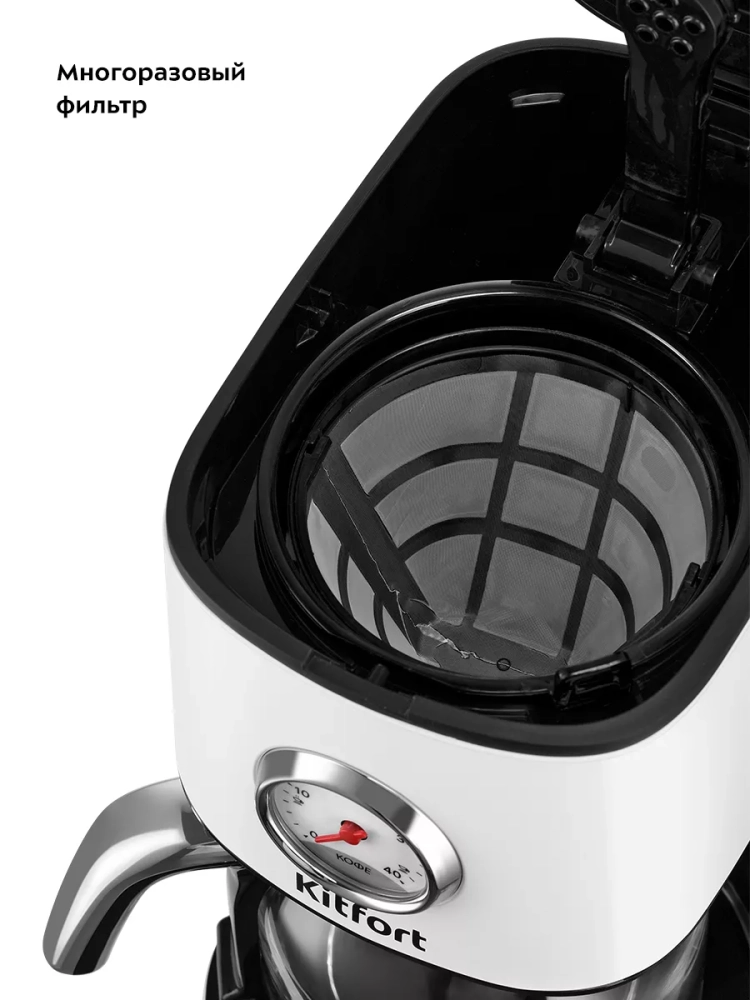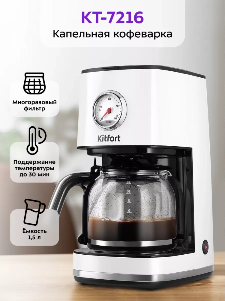 Капельная кофеварка Kitfort КТ-7216 готовит ароматный черный кофе из молотого кофе.