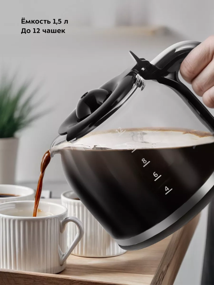 Резервуар для воды емкостью 1,5 л позволяет за один раз приготовить кофе на 12 чашек (по 125 мл). Внутри резервуара для воды и на кофейнике нанесены соответствующие отметки, поэтому вам будет удобно приготовить нужное количество чашек кофе. Кофейник стеклянный, поэтому вы всегда можете видеть, сколько кофе осталось.