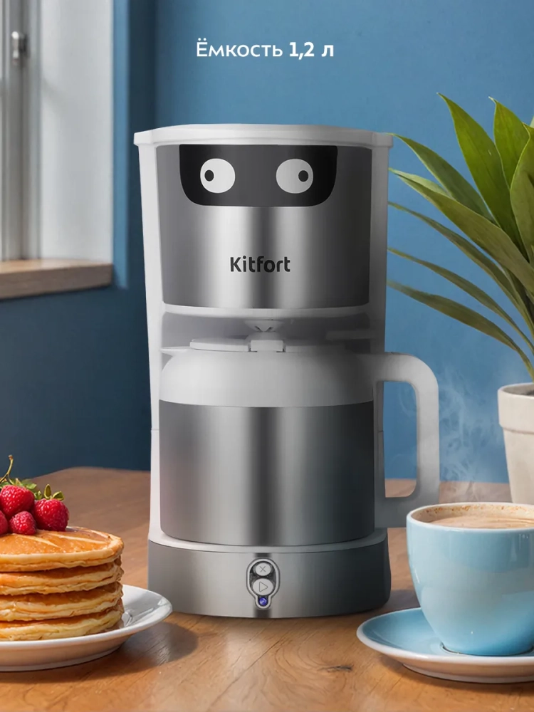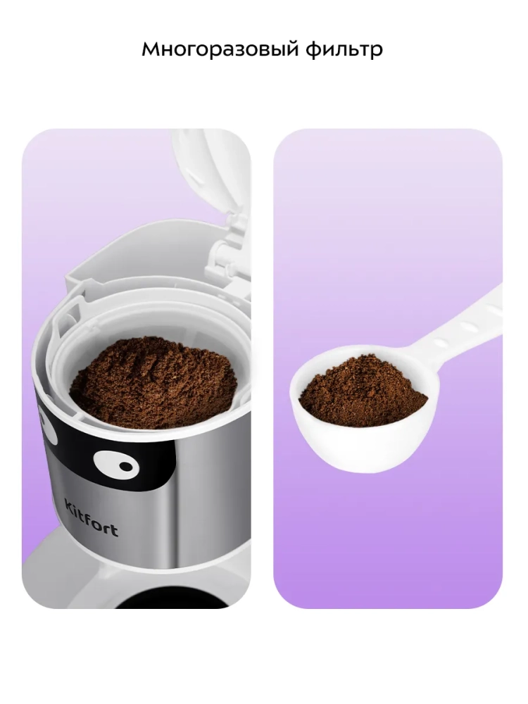Капельная кофеварка Kitfort КТ-7326 готовит ароматный черный кофе из молотого кофе.