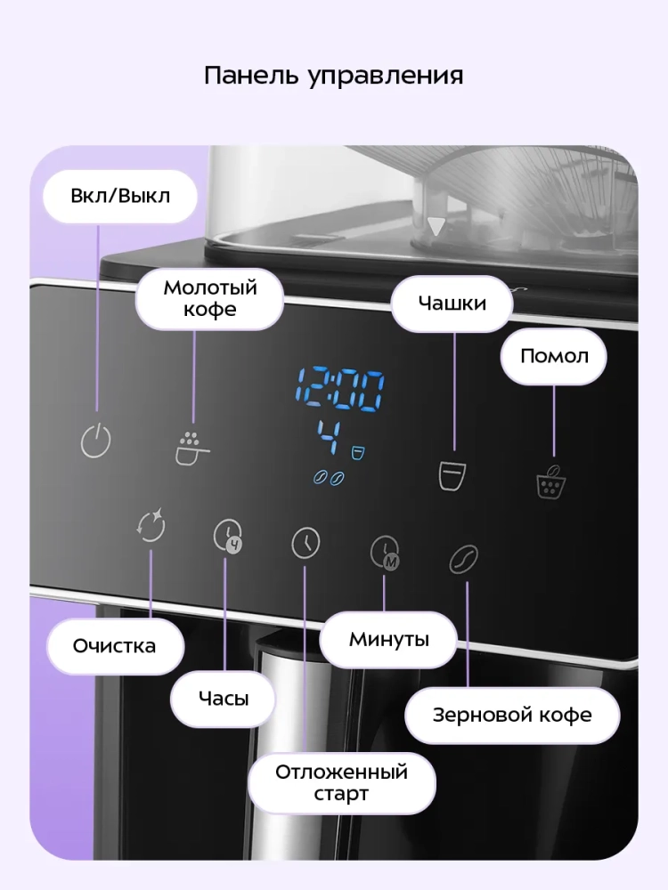 Функция отложенного старта позволит начать приготовление кофе в заданное время. Установите время приготовления, и к моменту, когда вы проснетесь, вас будет ждать ароматный свежезаваренный кофе.