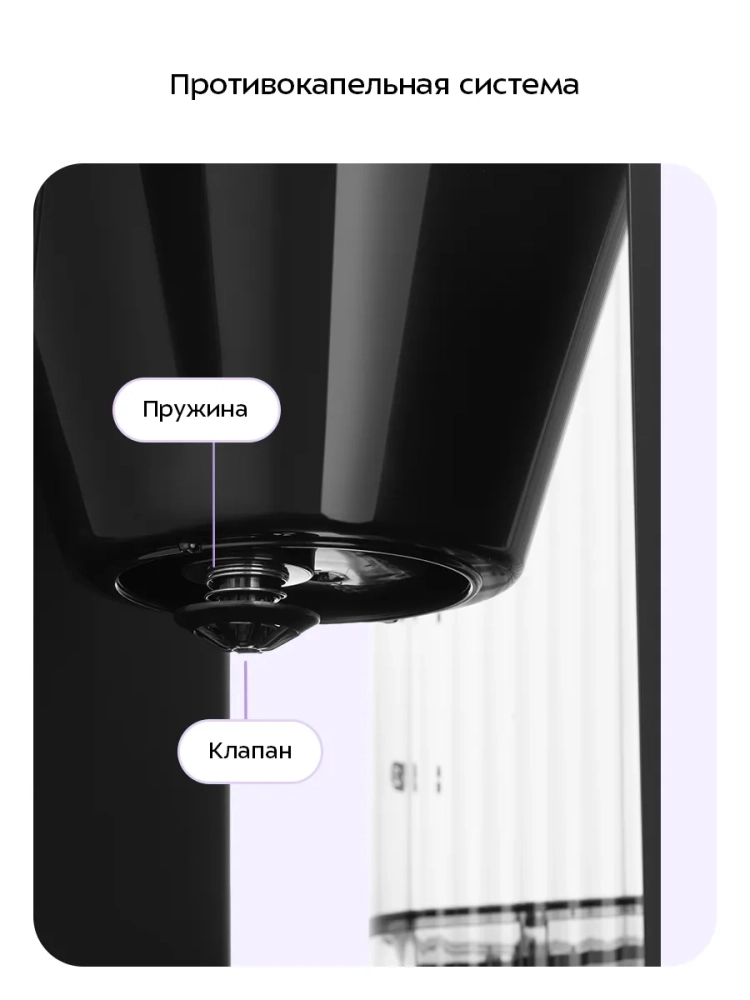 Воронка кофемашины оборудована противокапельной системой — затвором, останавливающим подачу кофе при вынимании кофейника из кофемашины. Вы можете налить кофе в чашку, не дожидаясь окончания приготовления.