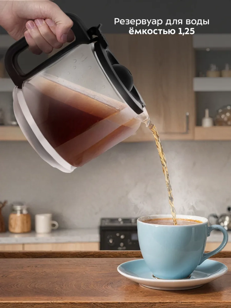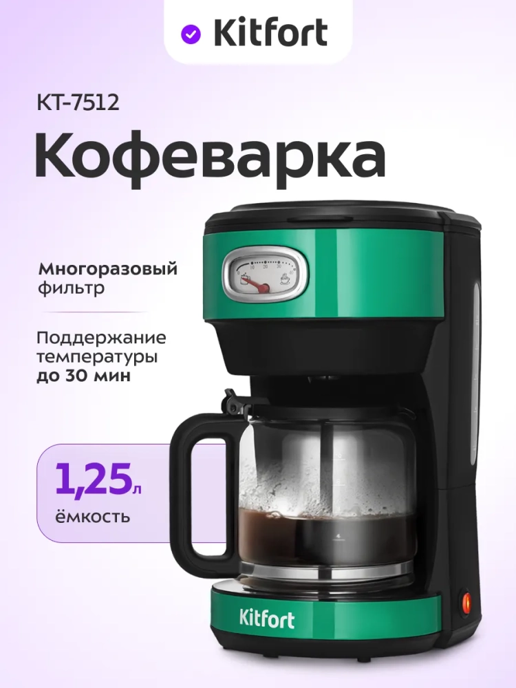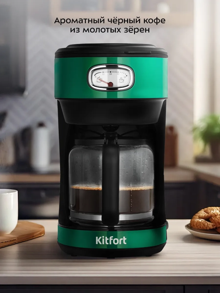 Капельная кофеварка Kitfort КТ-7512 готовит ароматный черный кофе из молотого кофе.
