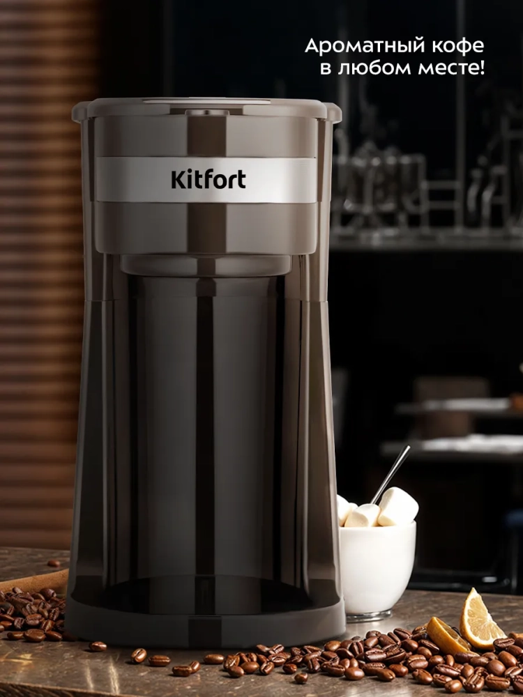Капельная кофеварка Kitfort КТ-7626 готовит ароматный черный кофе из молотого кофе одним нажатием кнопки. \nВ кофеварке горячая вода медленно поступает в фильтр с молотым кофе. Пройдя через него, вода попадает в термокружку, которая сохранит тепло вашего кофе. Внутренняя часть термокружки выполнена из нержавеющей стали, а внешняя — из пластика. Крышка термокружки позволяет пить кофе на ходу, благодаря удобной форме отверстия для питья, которое можно закрывать, например, при ходьбе. \nМногоразовым фильтром можно пользоваться неограниченное количество раз. Сетка фильтра изготовлена из нейлона. Фильтр вмещает до 20 г молотого кофе, а резервуар для воды имеет емкость 420 мл. \nКофеварка легкая и занимает мало места, что очень удобно в квартирах с маленькими кухнями. Устройство предназначено для приготовления кофе в домашних условиях или в офисе. \nНапряжение: ~220–240 В, 50/60 Гц. \nМощность: 650–750 Вт. \nКласс защиты от поражения электрическим током: I. \nЕмкость термокружки: 450 мл. \nЕмкость резервуара для воды: 420 мл. \nМатериал сетки фильтра: нейлон. \nДлина шнура: 0,6 м. \nРазмер устройства: 130 х 175 х 245 мм.