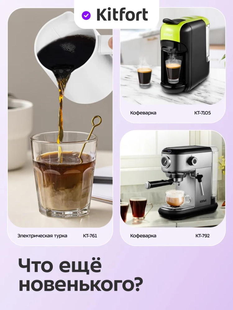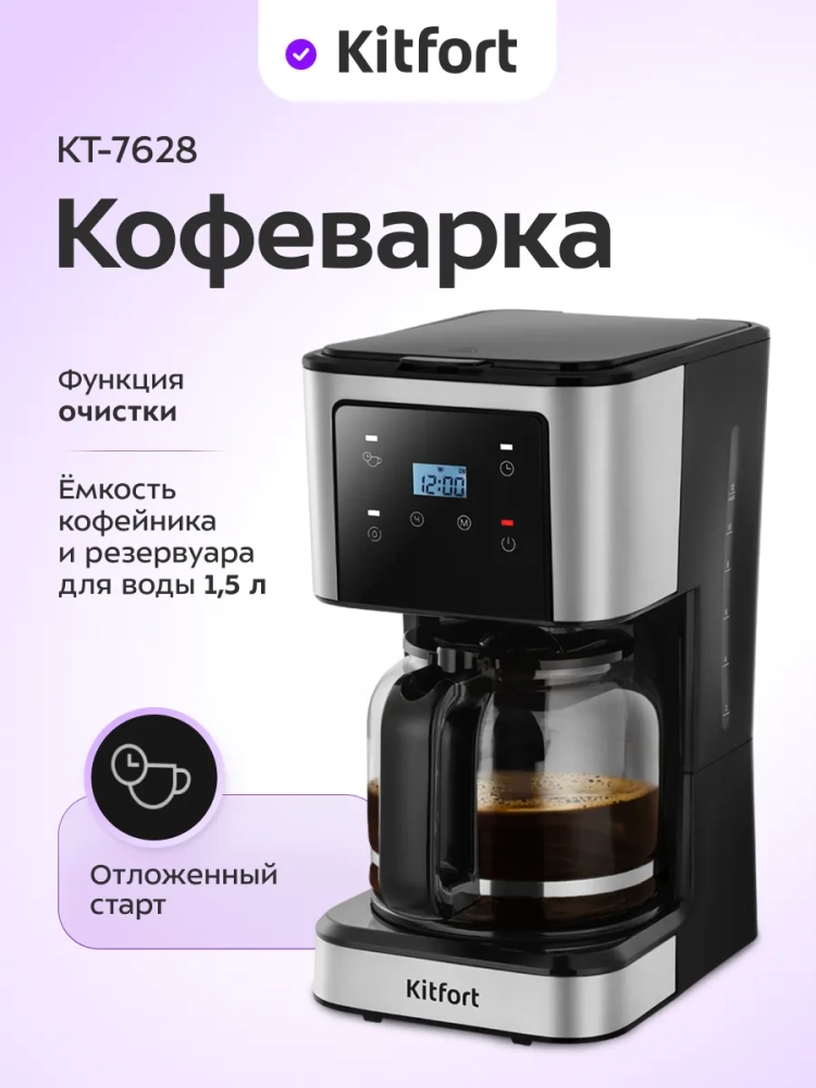 Капельная кофеварка Kitfort КТ-7628 готовит ароматный черный кофе из молотого кофе.