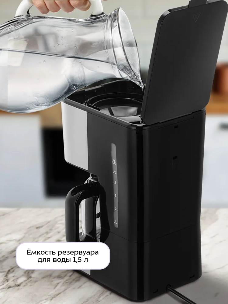 Резервуар для воды емкостью 1,5 л позволяет за один раз приготовить кофе на 12 чашек (по 120 мл). На резервуаре для воды и кофейнике нанесены соответствующие отметки, поэтому вам будет удобно приготовить нужное количество чашек кофе. Кофейник стеклянный, поэтому вы всегда можете видеть, сколько кофе осталось.