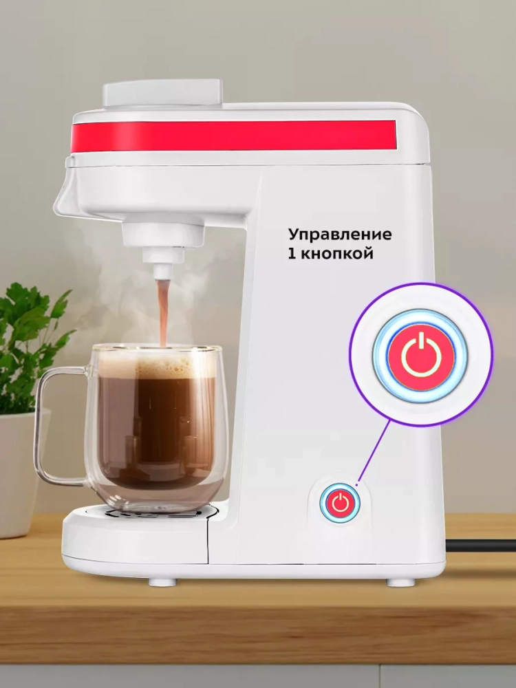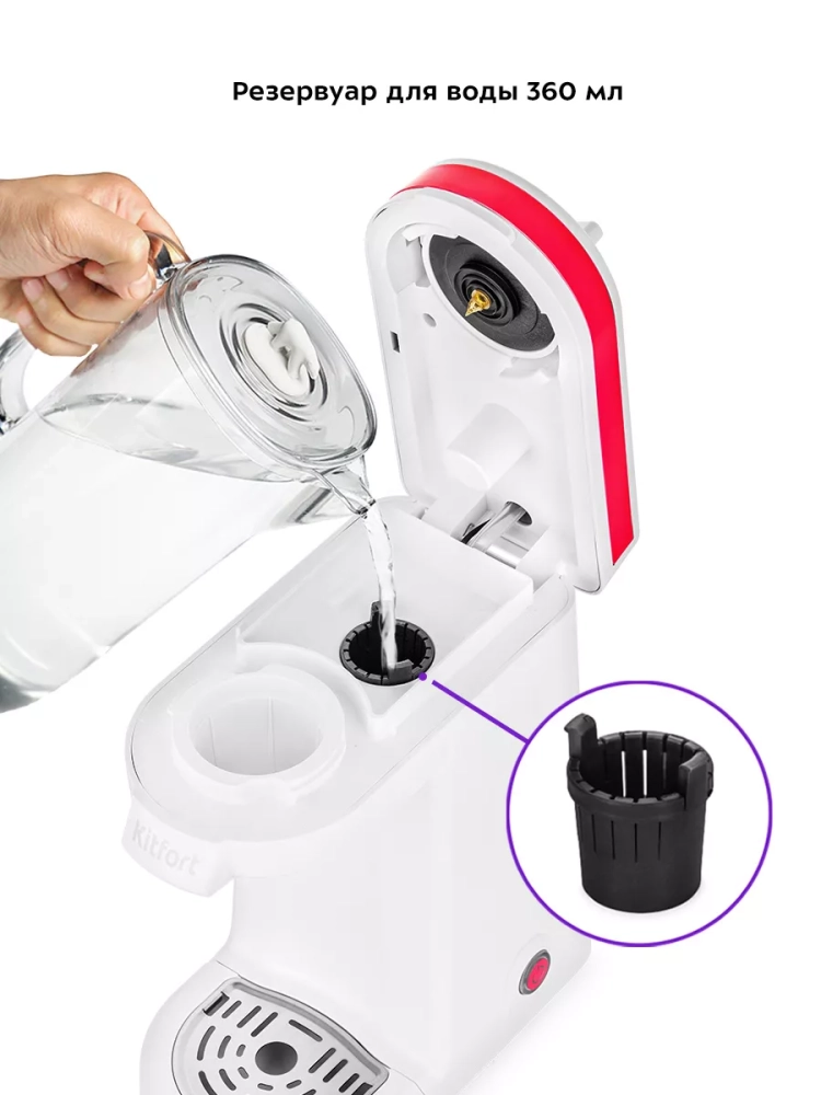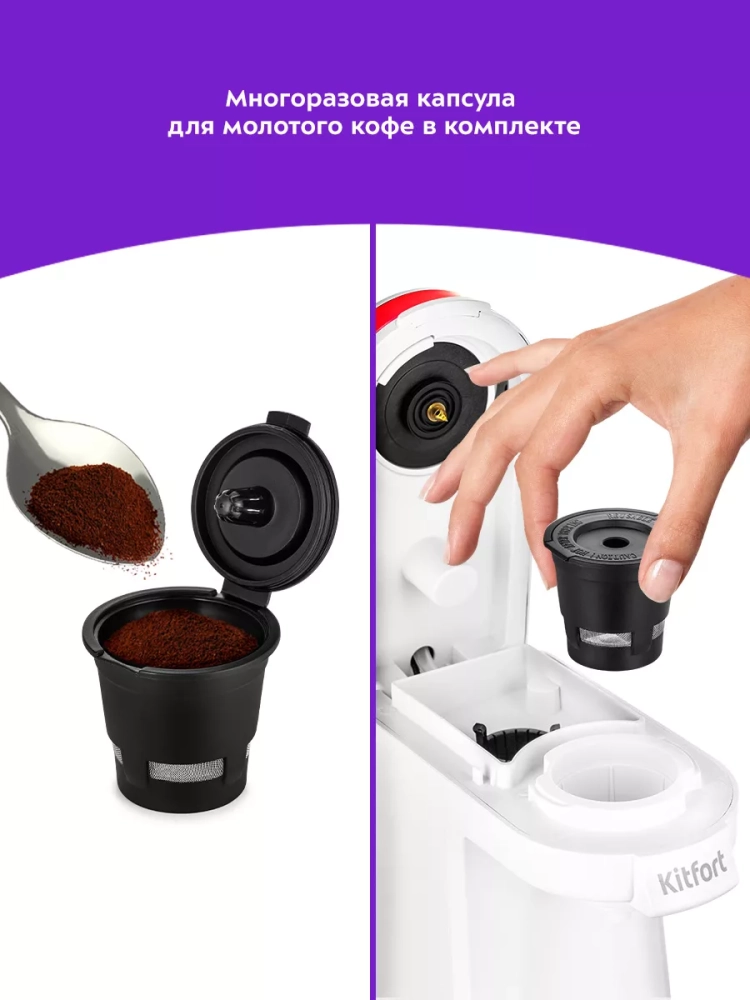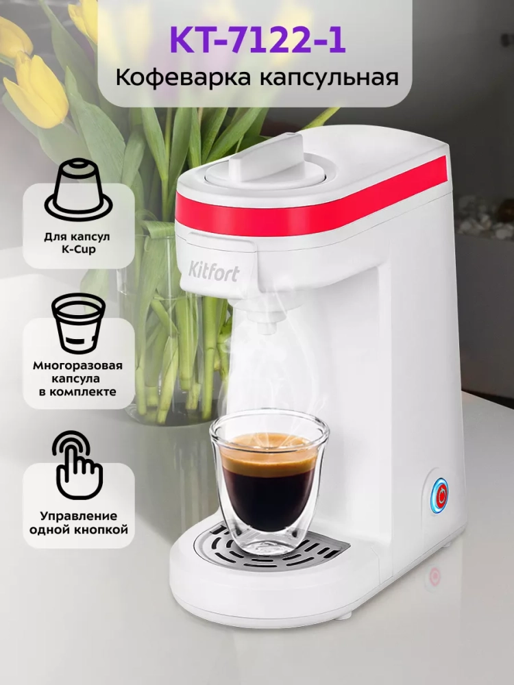 Капсульная кофеварка Kitfort KT-7122 поможет приготовить кофе, чай или какао в капсулах. Кофеварка Китфорт KT-7122 готовит кофе под давлением, поэтому вы можете приготовить эспрессо, лунго или другие кофейные напитки на основе эспрессо. Для данной кофеварки подходят капсулы стандарта K-Cup. Также в комплекте есть многоразовая капсула, которую можно наполнить самостоятельно, если у вас закончатся одноразовые капсулы. Управление кофеваркой очень простое и осуществляется всего одной кнопкой.