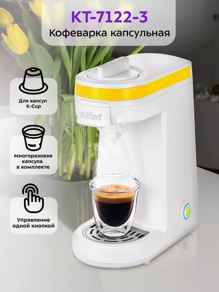 Капсульная кофеварка Kitfort KT-7122 поможет приготовить кофе, чай или какао в капсулах. Кофеварка Китфорт KT-7122 готовит кофе под давлением, поэтому вы можете приготовить эспрессо, лунго или другие кофейные напитки на основе эспрессо. Для данной кофеварки подходят капсулы стандарта K-Cup. Также в комплекте есть многоразовая капсула, которую можно наполнить самостоятельно, если у вас закончатся одноразовые капсулы. Управление кофеваркой очень простое и осуществляется всего одной кнопкой.