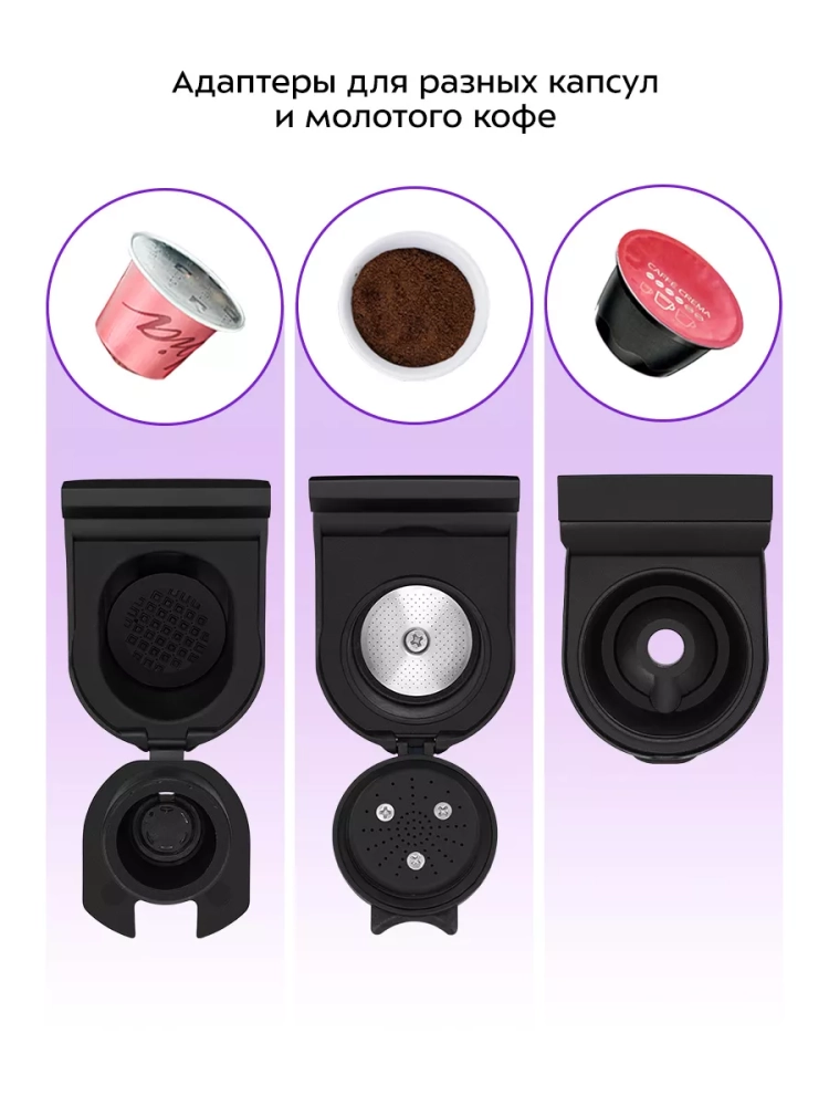 Кофеварка «3 в 1» Kitfort КТ-7462 — многофункциональное устройство, сочетающее в себе функции капсульной и рожковой кофеварок. Благодаря адаптерам кофеварка подходит для капсул типа Nespresso Original и Dolce Gusto, а также для молотого кофе.
