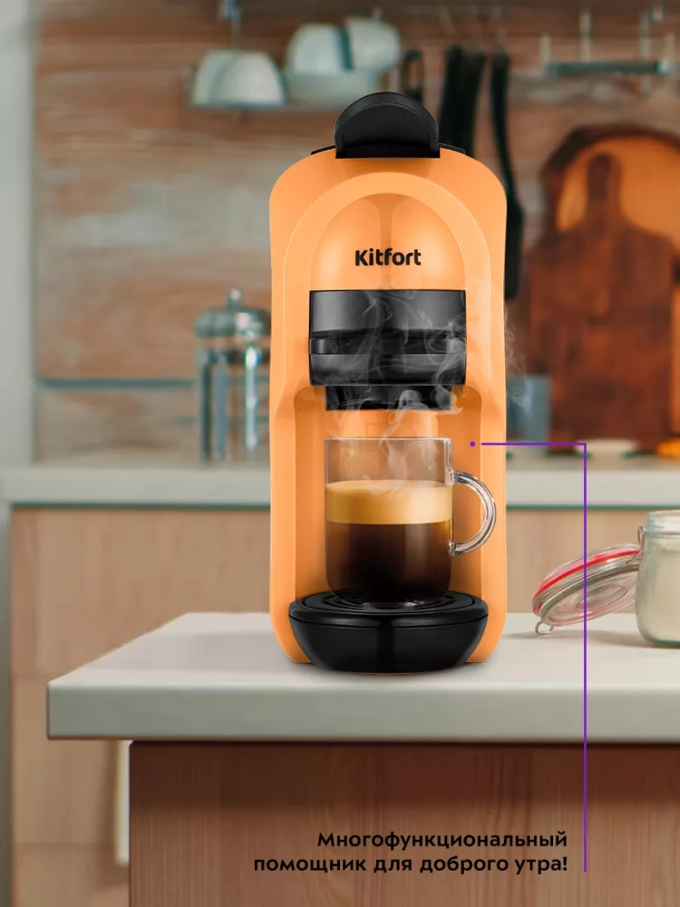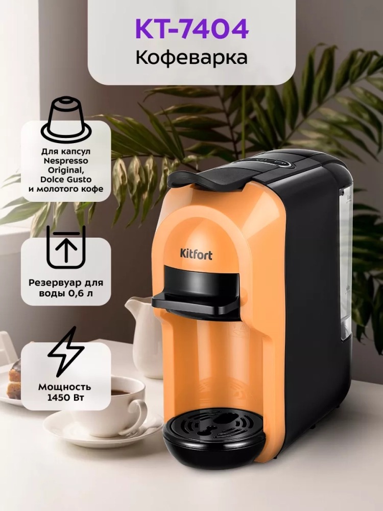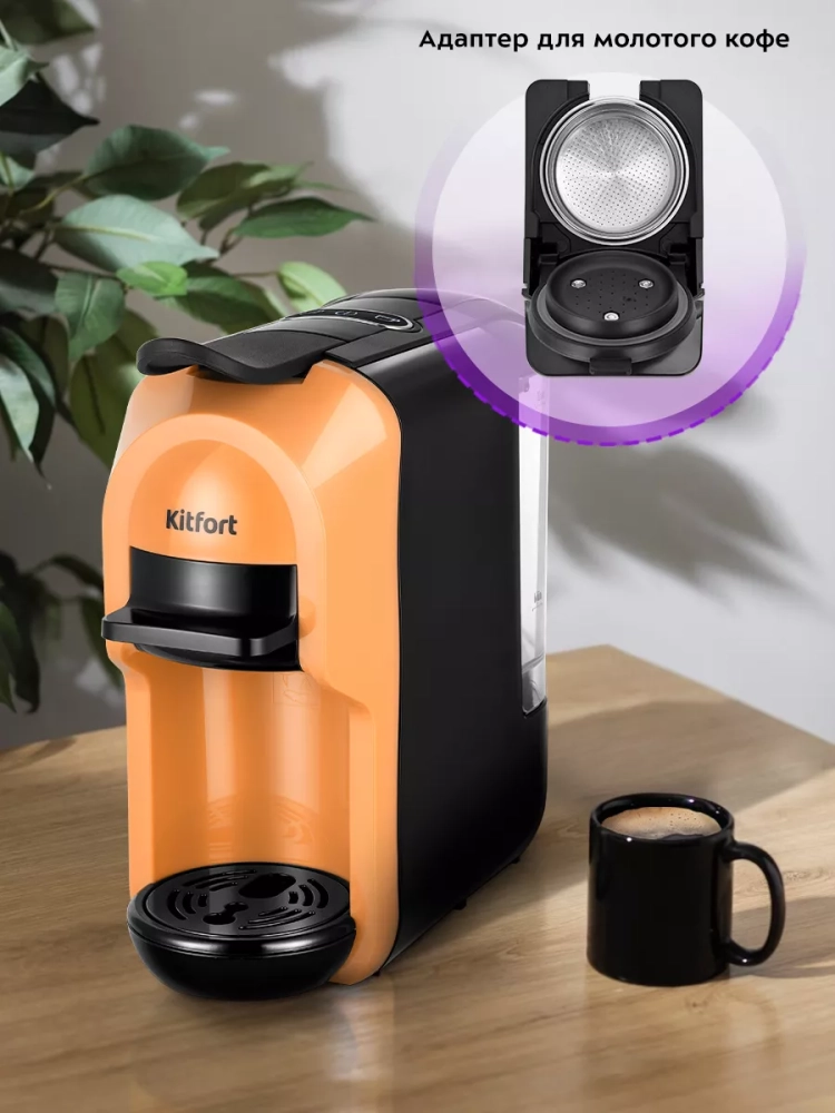 Кофеварка Kitfort КТ-7404 (3 в 1) — многофункциональное устройство, сочетающее в себе функции капсульной и рожковой кофеварки. Благодаря адаптерам кофеварка подходит для капсул типа Nespresso и Dolce Gusto, а также для молотого кофе.