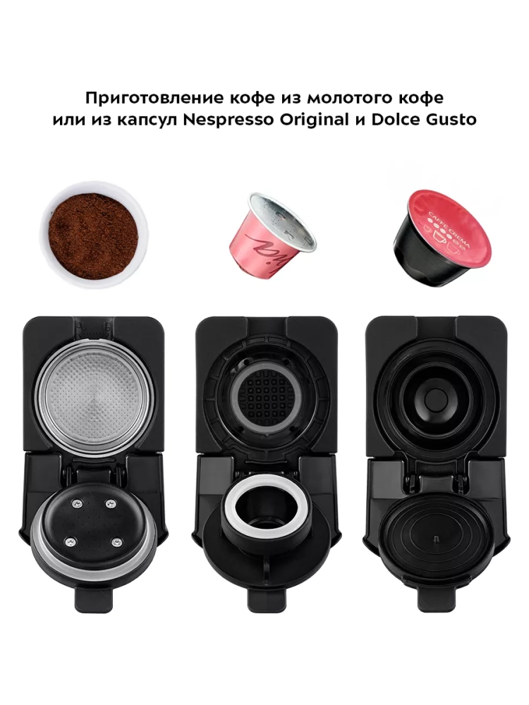 Капсульно-рожковая кофеварка поможет приготовить кофе эспрессо, американо или лунго, а также множество других видов кофе на ваш вкус.