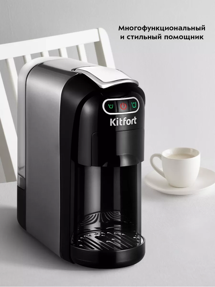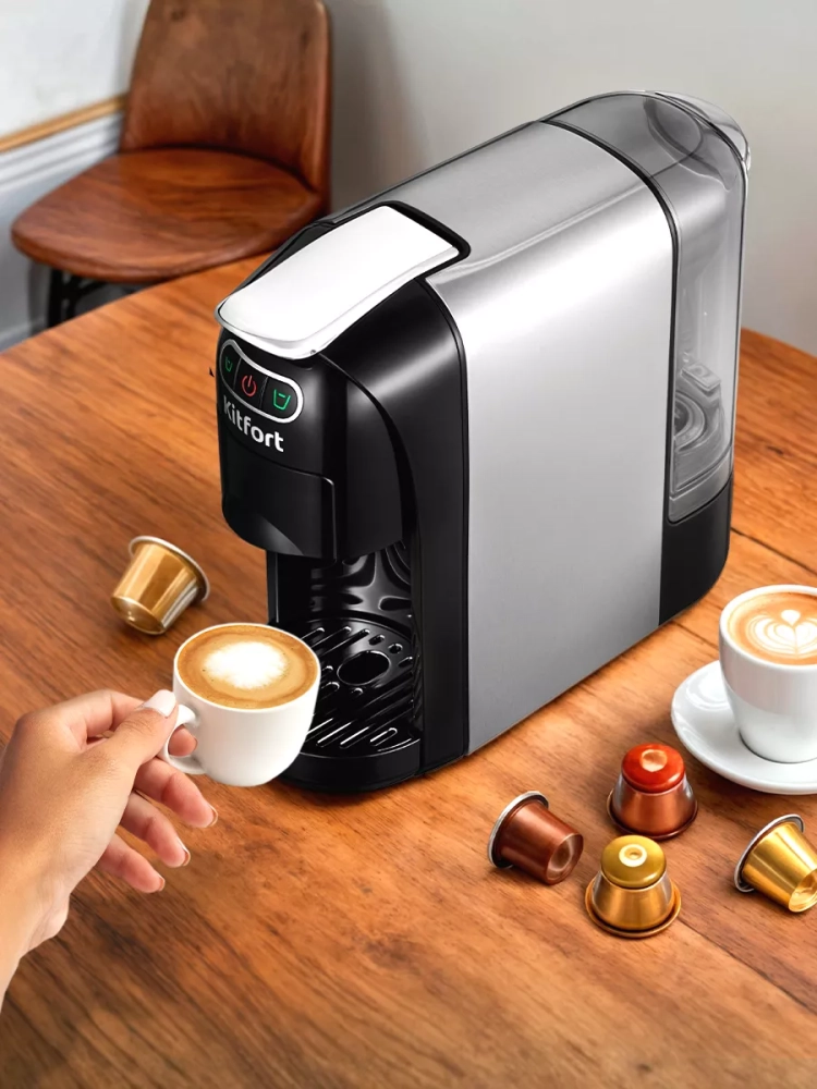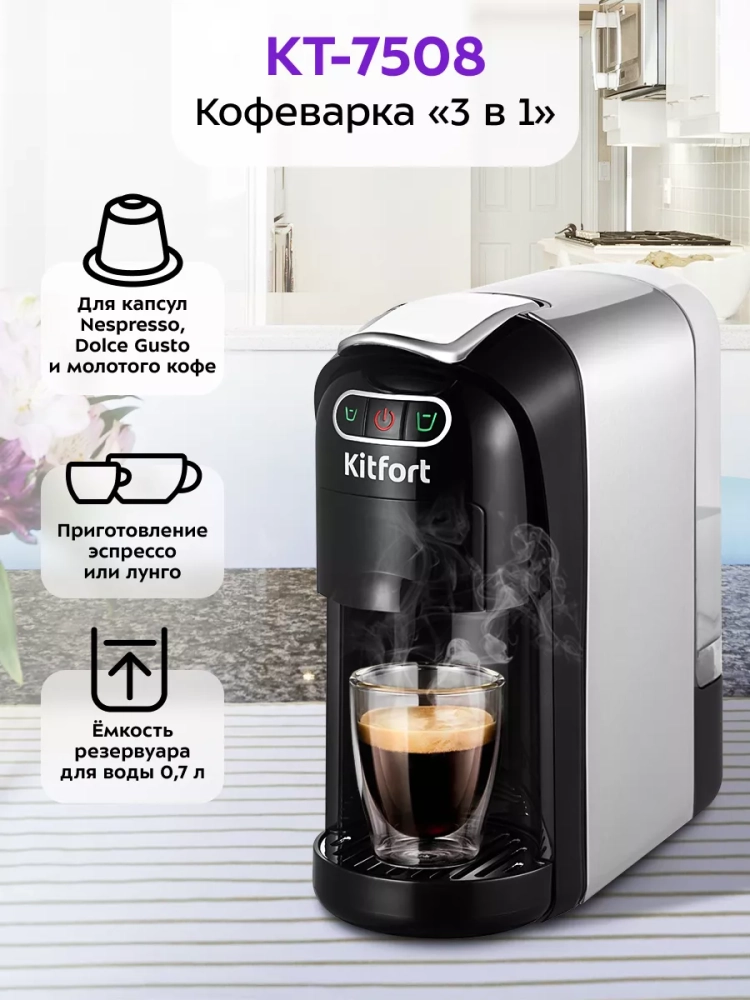 Кофеварка Kitfort «3 в 1» КТ-7508 — многофункциональное устройство, сочетающее в себе функции капсульной и рожковой кофеварки. Благодаря адаптерам кофеварка подходит для капсул типа Nespresso Original и Dolce Gusto, а также для молотого кофе.