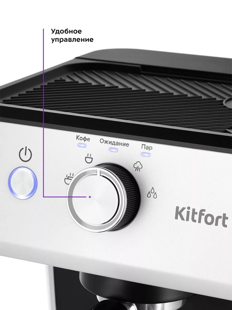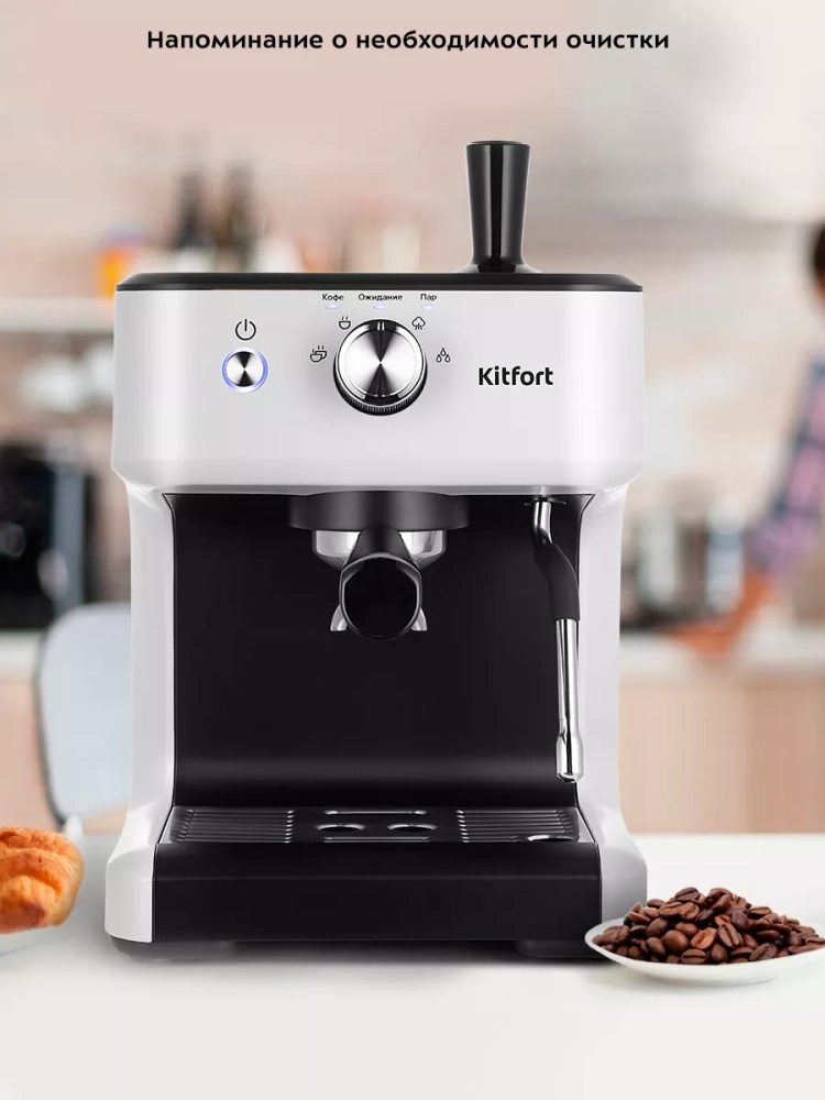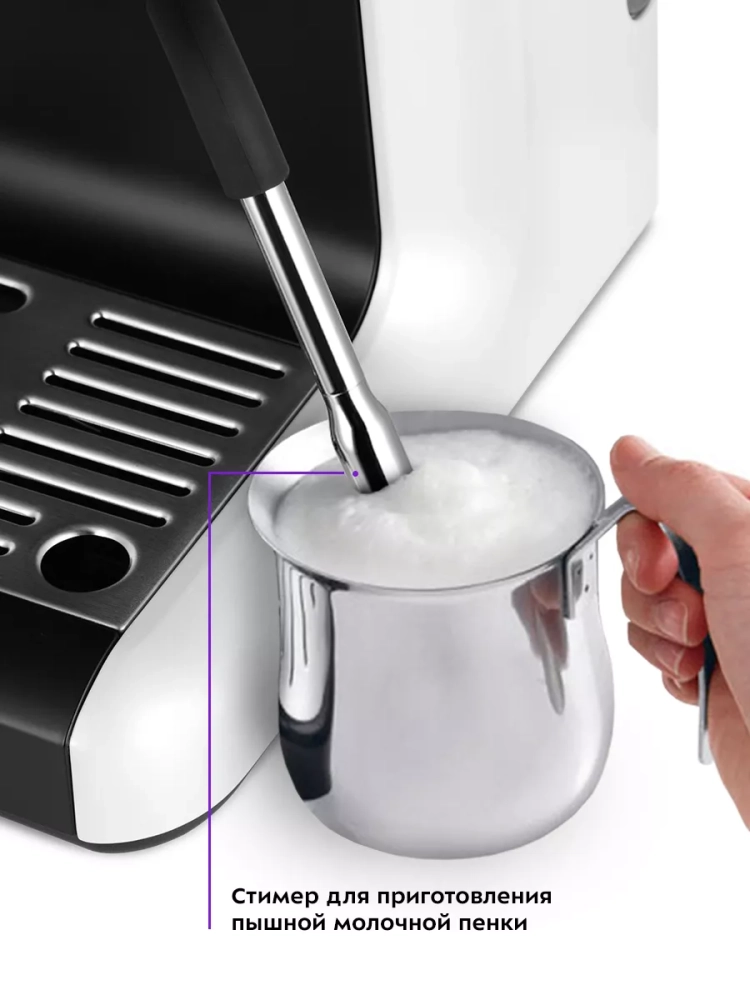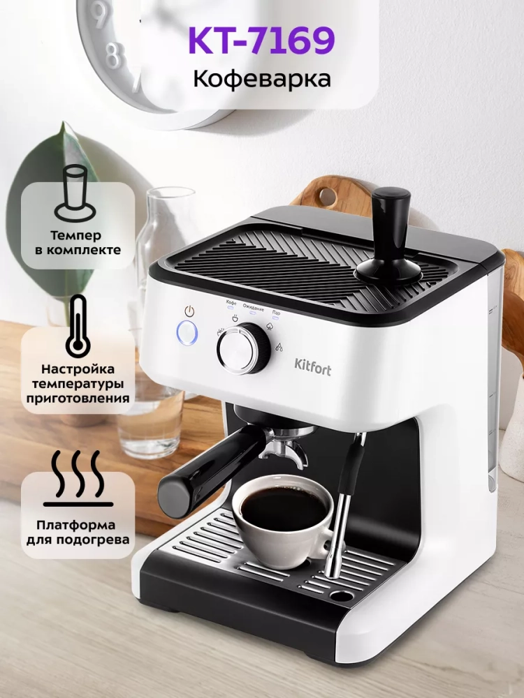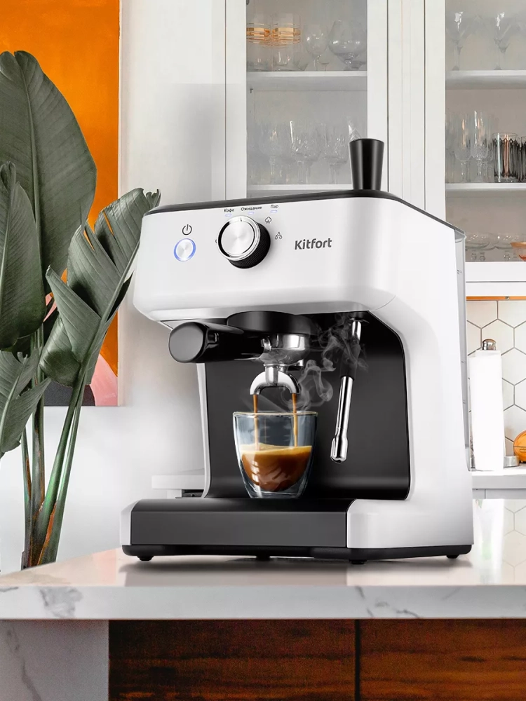 Кофеварка Kitfort КТ-7169 поможет приготовить кофе эспрессо, капучино или латте, а также множество других видов кофе на ваш вкус. С помощью стимера вы можете приготовить молочную пенку, а также подогреть паром остывший чай или молоко.