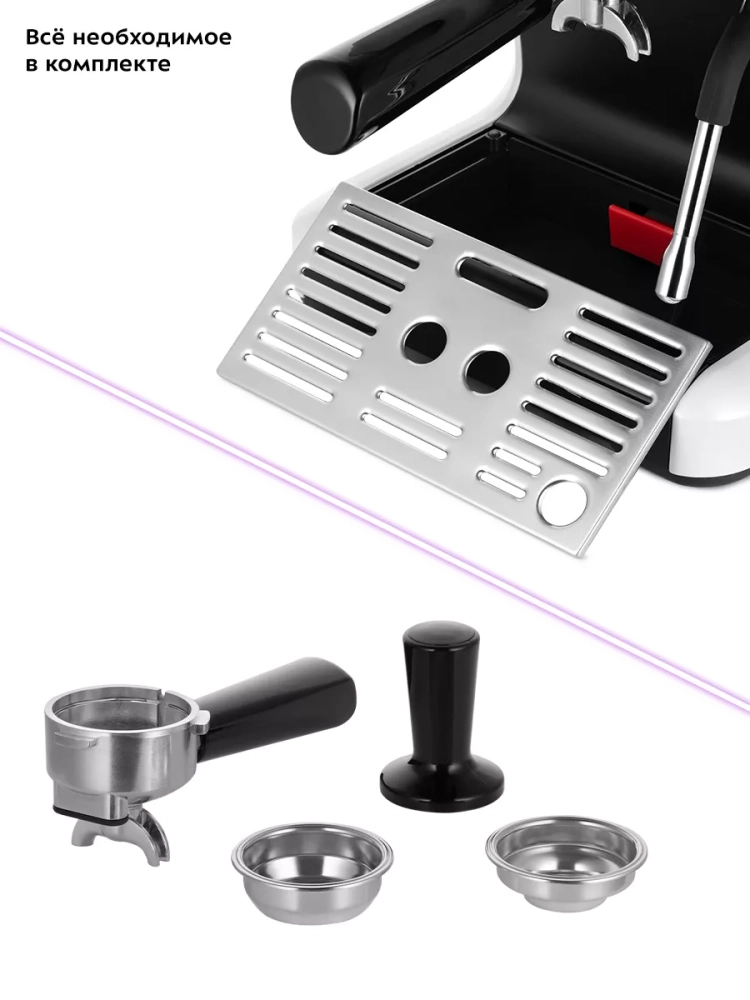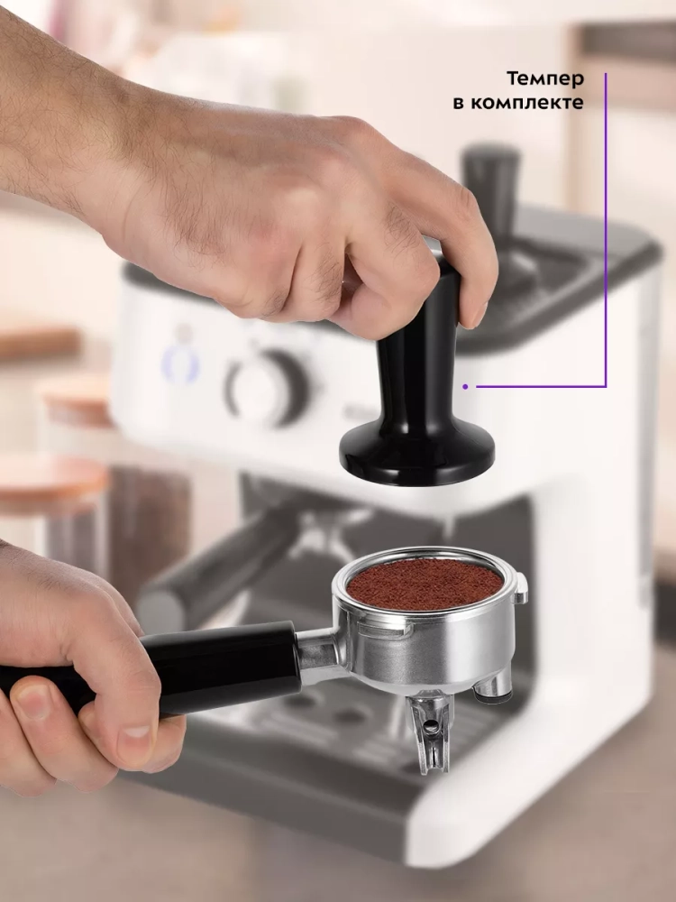 Ключевым отличием кофеварки от всех остальных кофеварок, турок и прочих кофейных устройств является наличие рожка, его часто называют холдер. Молотый кофе помещается в фильтр рожка и прессуется в таблетку. Процесс трамбовки также называют темперовкой. Правильная темперовка — довольно-таки ювелирный процесс. Если утрамбовать слишком сильно, то воде потребуется гораздо больше времени для прохождения сквозь плотный слой кофе. Вкус напитка будет очень горьким. Если утрамбовать слабо, то вода пройдет сквозь неплотный слой слишком быстро, и вкус кофе будет кислым и водянистым. Темпер, поставляемый в комплекте, поможет утрамбовать в рожке кофейную таблетку.