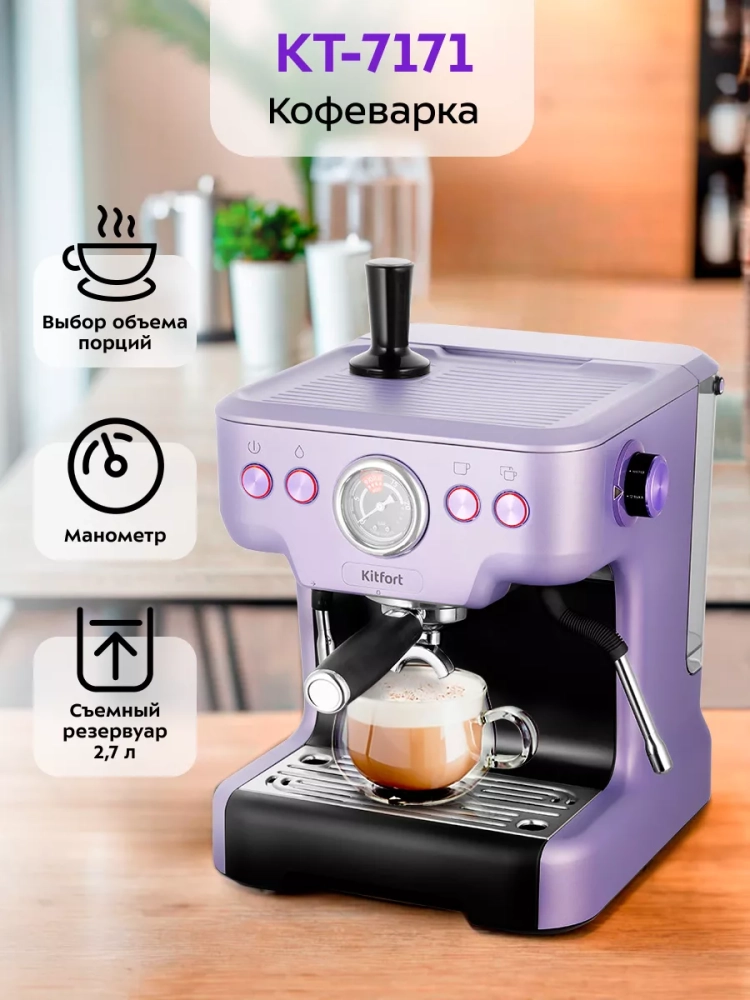 Рожковая кофеварка Kitfort КТ-7171 поможет приготовить кофе эспрессо, капучино или латте, а также множество других видов кофе на ваш вкус. С помощью стимера в рожковой кофеварке вы можете приготовить молочную пенку или подогреть паром остывший чай или молоко.