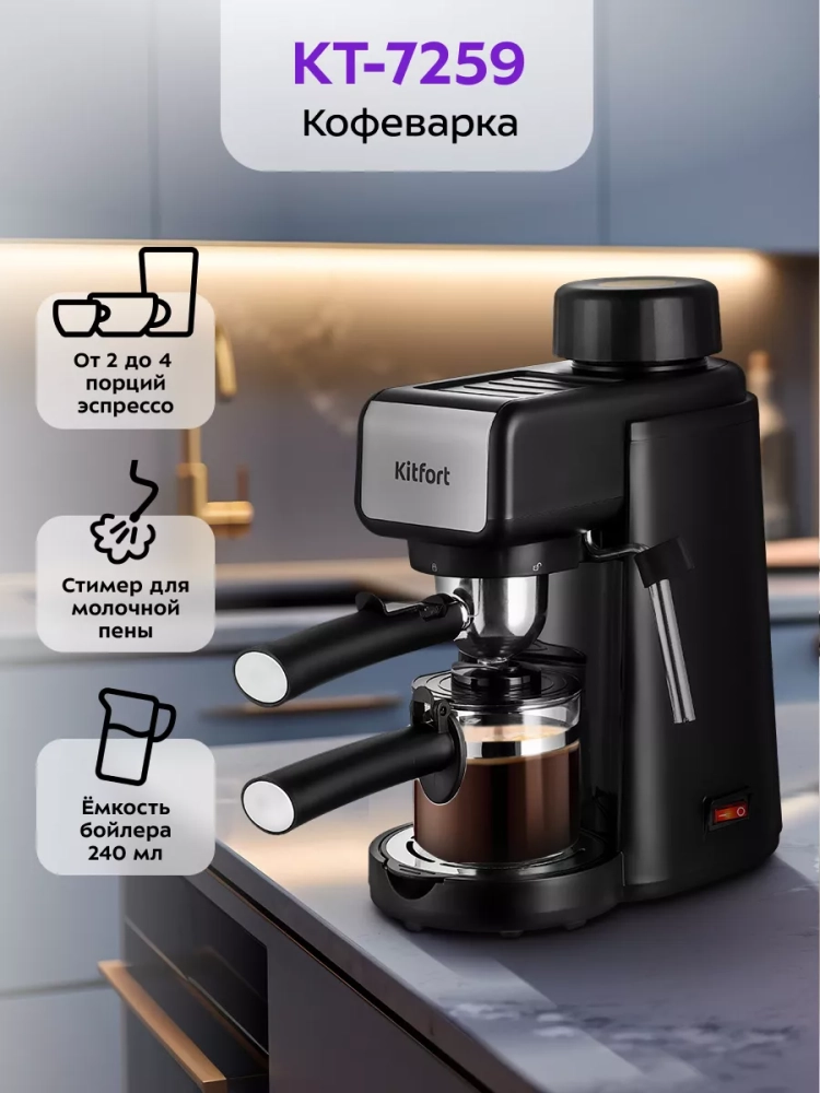 Рожковая полуавтоматическая кофеварка Kitfort КТ-7259 поможет приготовить от 2 до 4 порций эспрессо за один раз. С помощью стимера вы можете приготовить молочную пенку, а также подогреть паром остывший чай или молоко.