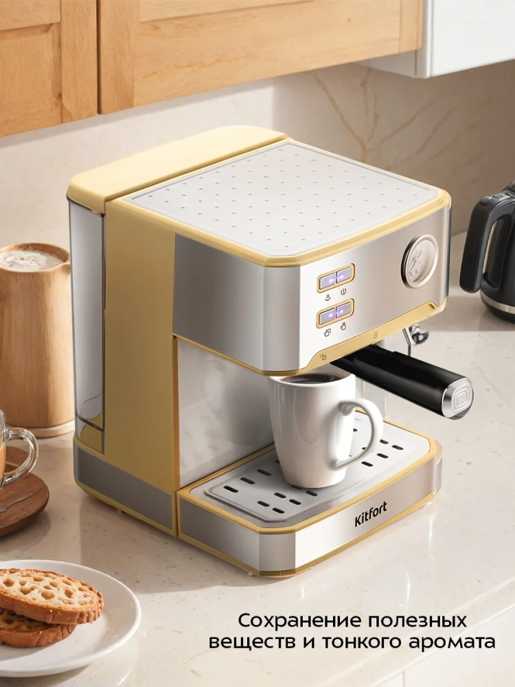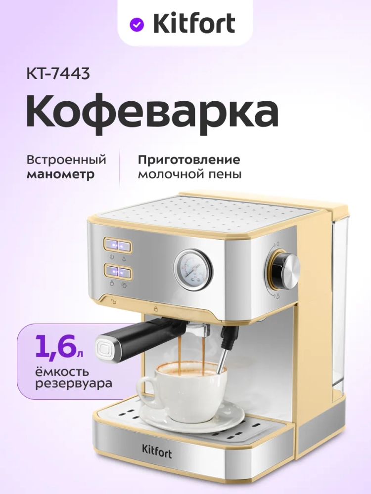 Кофеварка Kitfort КТ-7443 поможет приготовить кофе эспрессо, капучино или латте, а также другие виды кофе на ваш вкус. С помощью стимера вы можете приготовить молочную пенку, а также подогреть паром остывший чай или молоко.