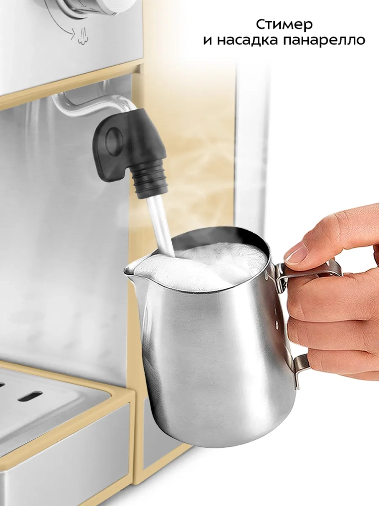 Молочную пенку для капучино можно сделать самостоятельно. Для приготовления пара и горячей воды в кофеварке есть паровая трубка — стимер. Стимер погружают в холодное молоко, включают подачу пара и взбивают молочную пенку. Насадка панарелло облегчает процесс приготовления молочной пенки.