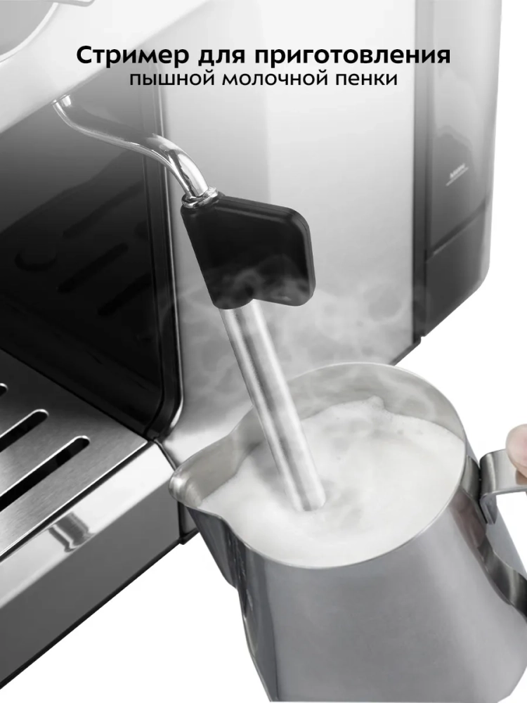 Кофеварка Kitfort КТ-7495 поможет приготовить кофе эспрессо, капучино или латте, а также множество других видов кофе на ваш вкус. С помощью стимера вы можете приготовить молочную пенку, а также подогреть паром остывший чай или молоко.