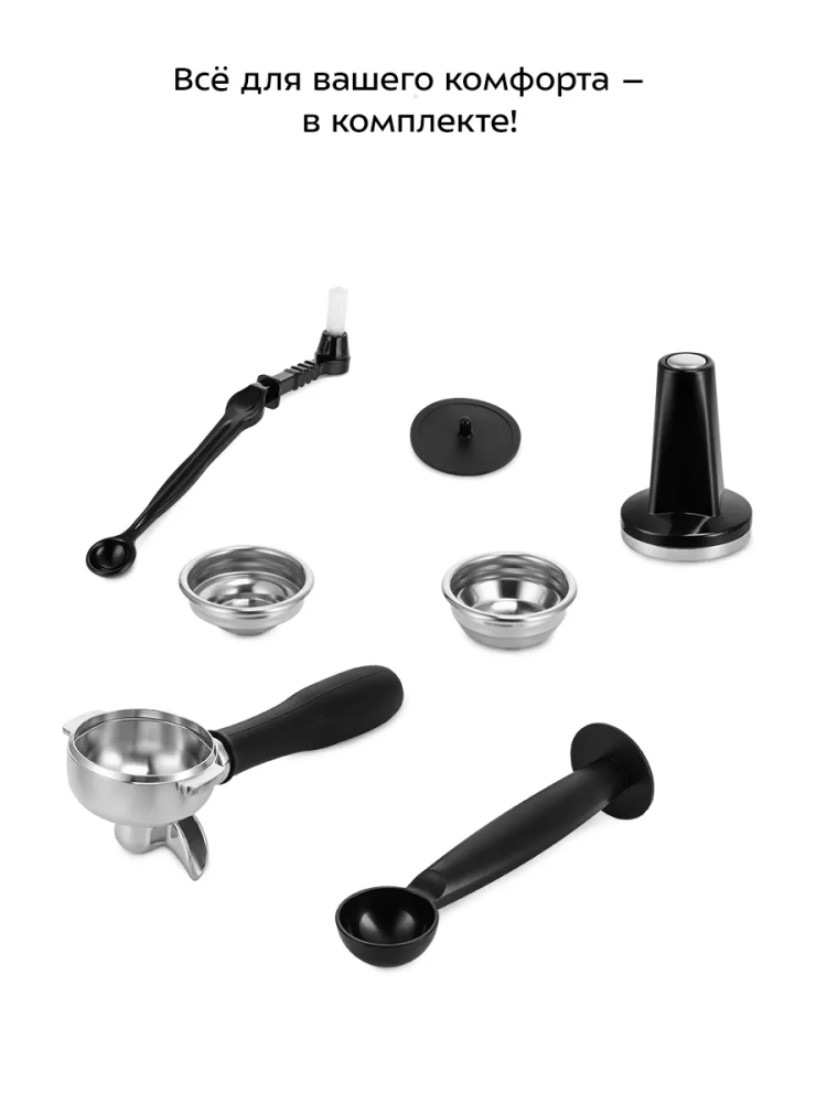 В комплекте к кофемашине КТ-7510 идёт холдер с фильтрами для кофе, темпер, щёточка для его отчистки и «слепой» фильтр. Он предназначен для избавления от кофейных масел в холдере, ведь они напрямую влияют на вкус кофе, делая его горьким и шершавым.