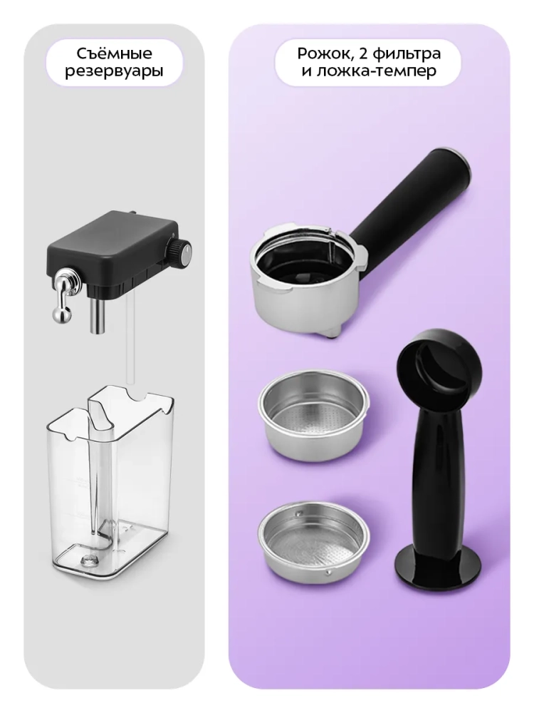 Металлические фильтры с лазерным нанесением отверстий долговечны и не требуют использования каких-либо расходующихся частей. Кофеварка оснащена съемным резервуаром для воды и металлическим рожком. Металлический рожок хорошо прогревается и поддерживает температуру проходящей воды, при этом напиток получается насыщенным, густым и с хорошей пенкой.