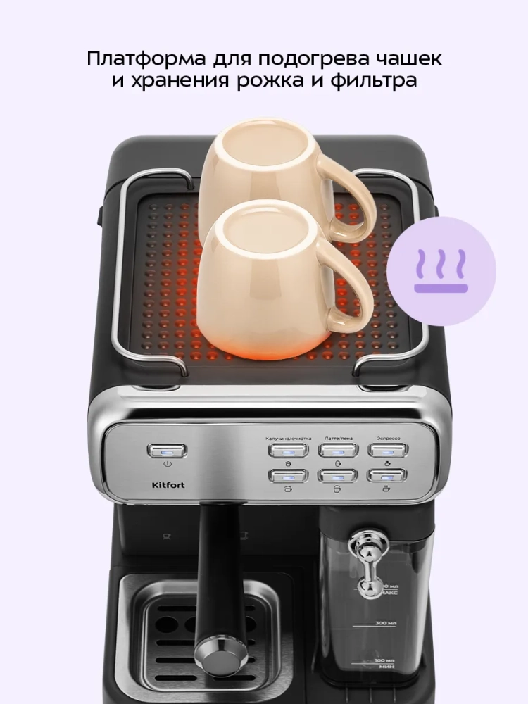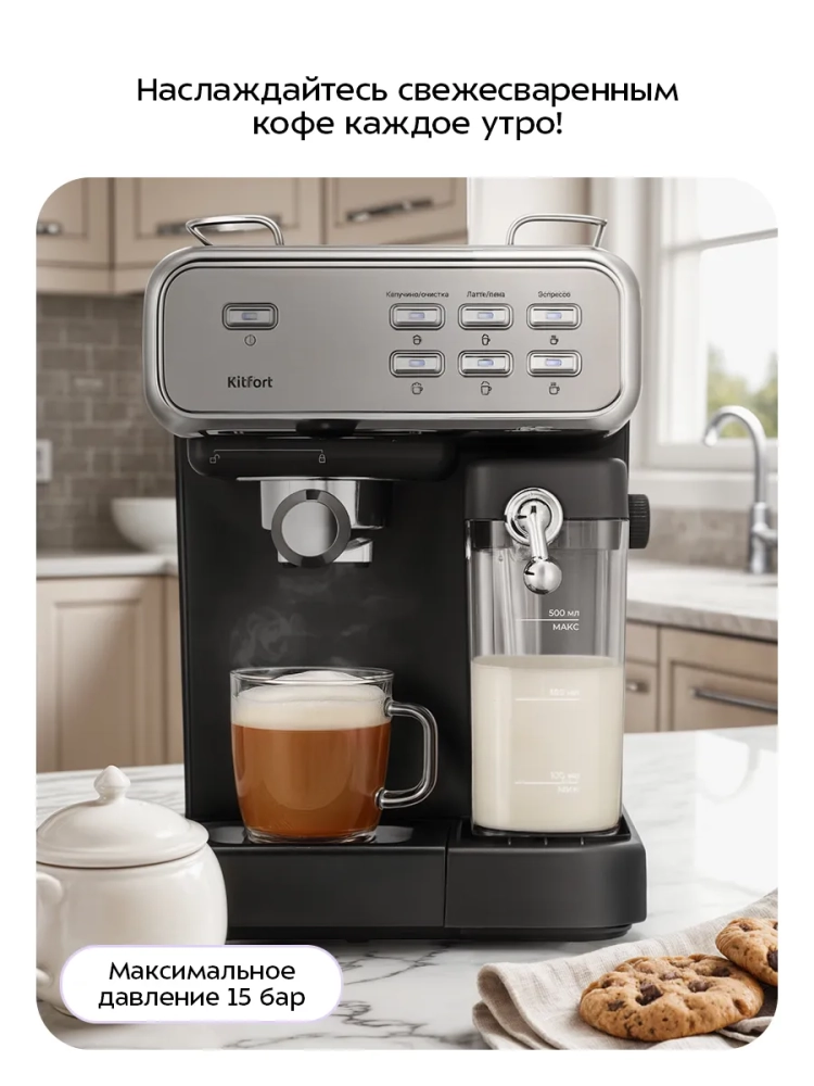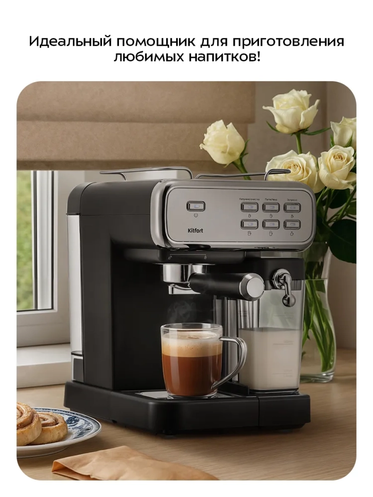 Кофеварка Kitfort КТ-7563 поможет приготовить кофе эспрессо, капучино или латте, а также множество других видов кофе на ваш вкус.