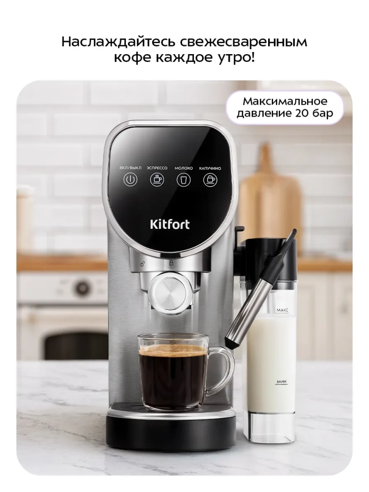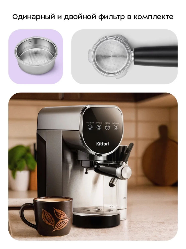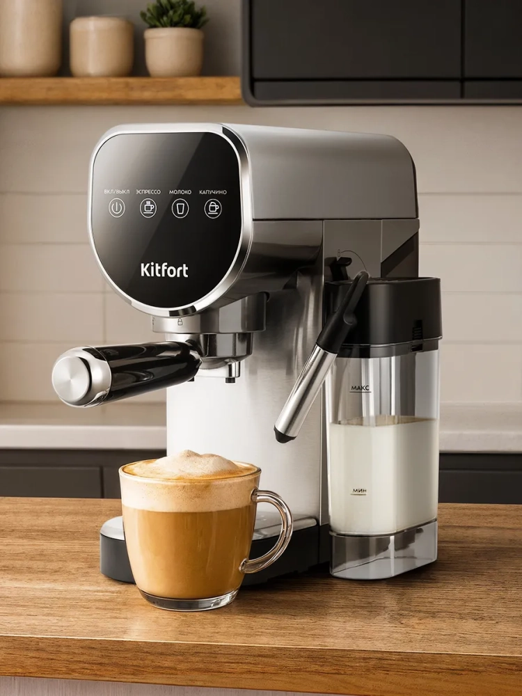Кофеварка Kitfort КТ-7692 поможет приготовить эспрессо или капучино, а также множество других видов кофе на ваш вкус.