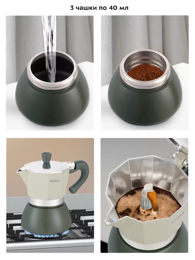 Каждая гейзерная кофеварка рассчитана на приготовление определённого количества чашек кофе. Объем резервуара и фильтра подобраны так, что воронку с фильтром наполняют молотым кофе полностью, а в резервуар для воды наливают столько воды, чтобы уровень воды был чуть ниже парового клапана. Таким образом вы получаете вкусный кофе и нет необходимости отмерять точное количество воды или молотого кофе в граммах. В воронку с фильтром кофеварки Китфорт KT-7150 помещается около 19 грамм кофе, а емкость резервуара для воды — 190 мл. Она рассчитана на приготовление 3 чашек кофе по 40 мл. Преимущество гейзерной кофеварки в простоте приготовления кофе. В сравнении с туркой, при приготовлении кофе в гейзерной кофеварке нет необходимости следить за поднятием пенки, а получаемый кофе не содержит гущи.